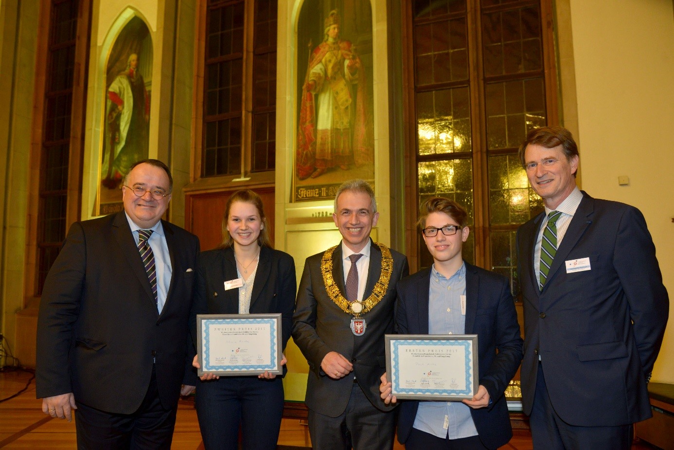 Am 23. Januar 2017 wurde im Kaisersaal des Frankfurter Römers zum 7. Mal der DFG Preis an den besten/ die beste Französischschüler/in des Rhein-Main-Gebietes verliehen. In einer knapp 3000 Worte umfassenden Arbeit und einem 10-minütigen Vortrag in französischer Sprache konnte Alicia Racke (Q1) die Jury, bestehend aus dem Präsidenten der DFG, einer Vertreterin des Staatlichen Schulamts, dem Sprachreferenten des Institut français und einem weiteren Französischlehrer, von sich überzeugen. In einem feierlichen Festakt wurde sie zur zweiten Siegerin gekürt.