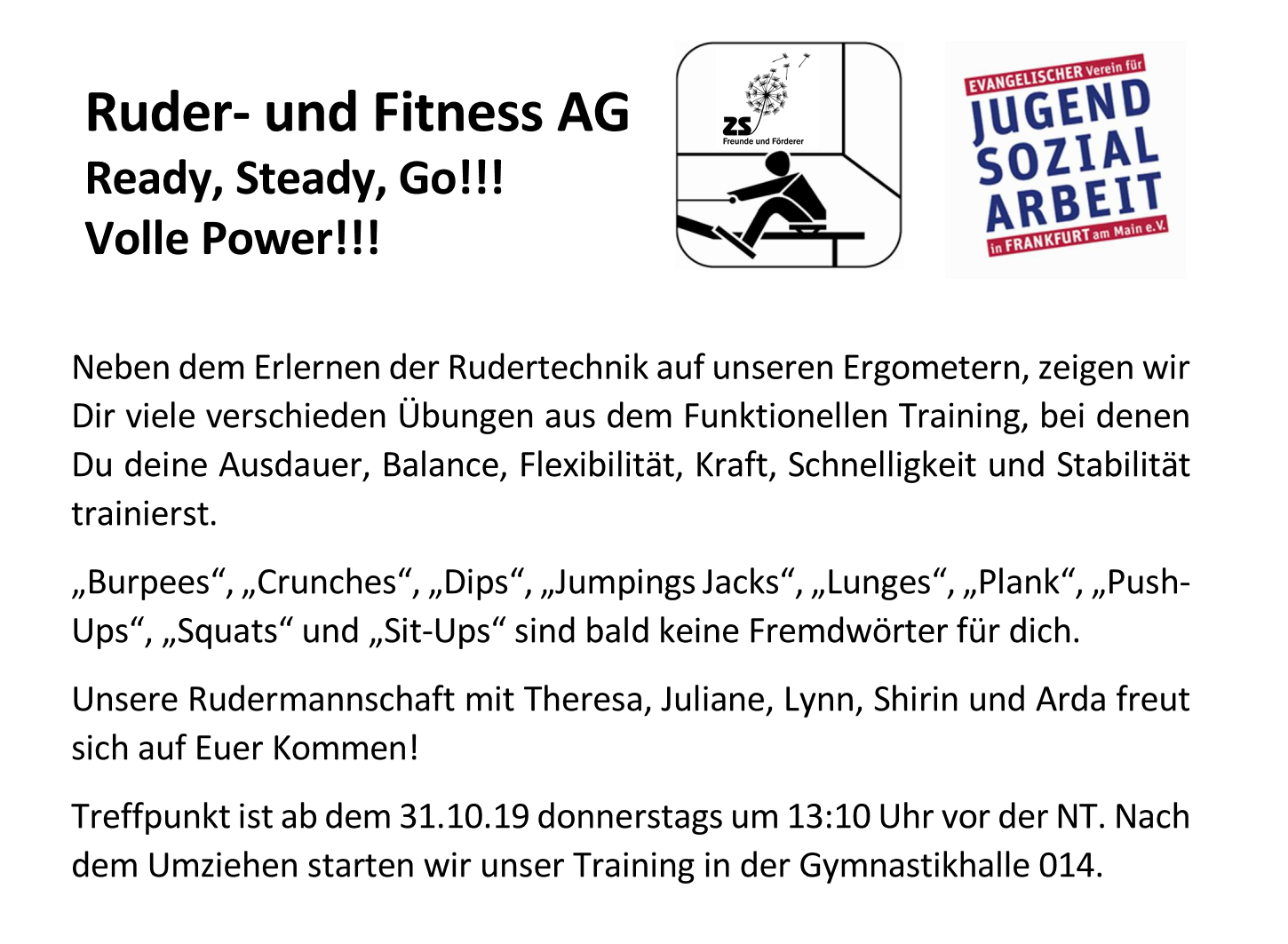 Unser Ruder- und Fitness AG Team um Theresa, Juliane, Lynn, Shirin und Arda freut sich über jeden interessierten Mitschüler*In. Die vier letztgenannten sind aufgrund dieser Kooperation mit der Frankfurter Rudergesellschaft Germania 1869 e.V. zum Rudersport gekommen.