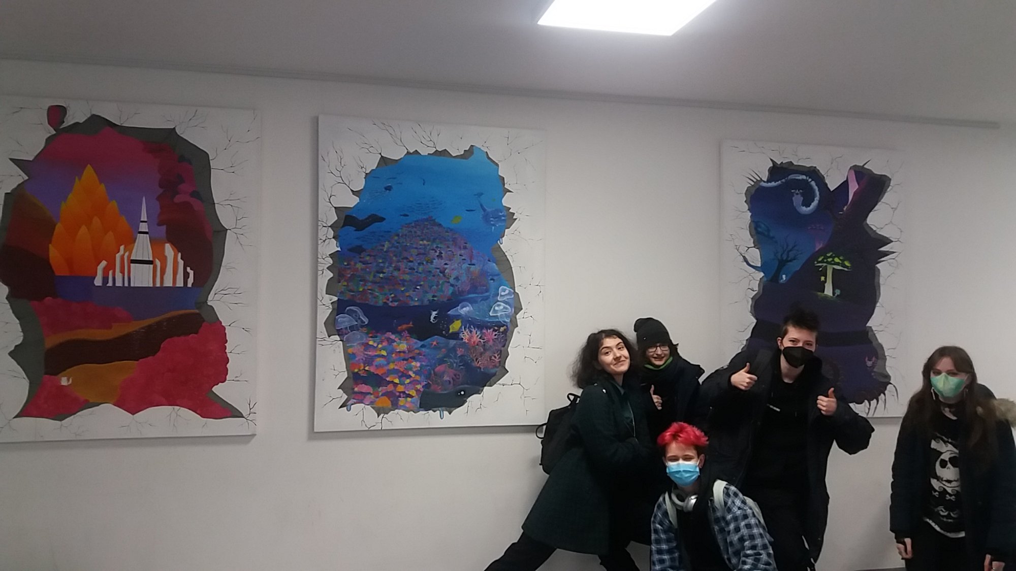 Die Gemälde auf den drei Leinwänden zeigen Durchbrüche in Fantasiewelten für all diejenigen, die sich im Schulalltag gerne mal kurz wegträumen wollen. Sie basieren auf Skizzen von K Burger (Schüler des Kunst-LK Q1) und wurden in beeindruckender Teamarbeit an zahlreichen Nachmittagen gemalt.