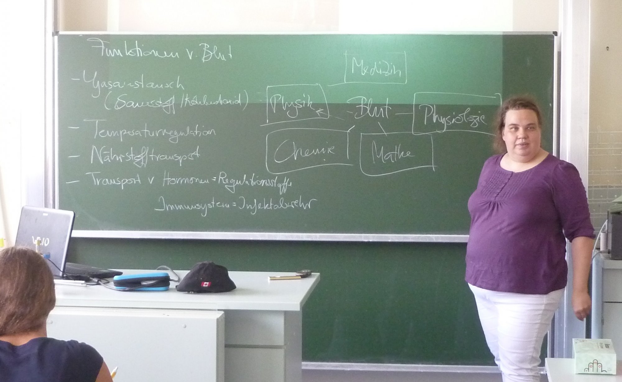 Die renommierte Expertin für Blutspurenanalyse Dr. Silke Brodbeck (Blutspureninstitut in Usingen) war an der Ziehenschule zu Gast beim Wahlpflichtkurs Naturwissenschaften 9 mit dem Halbjahresschwerpunkt „Physik in der Kriminalistik“. Auch diesmal referierte Frau Brodbeck zum Thema Blut und deren Besonderheiten. Besonders ist, dass Blut für eine Vielzahl von zentralen Prozessen (u.a. Versorgung mit Sauerstoff und Nährstoffen, Abtransport von CO2, Abwehr des Körpers gegen körperfremde Stoffe, Wundverschließung) im menschlichen Körper verantwortlich ist und es künstlich nicht herstellbar ist. Deswegen sind Blutspenden für eine Reihe von Operationen unabdingbar.