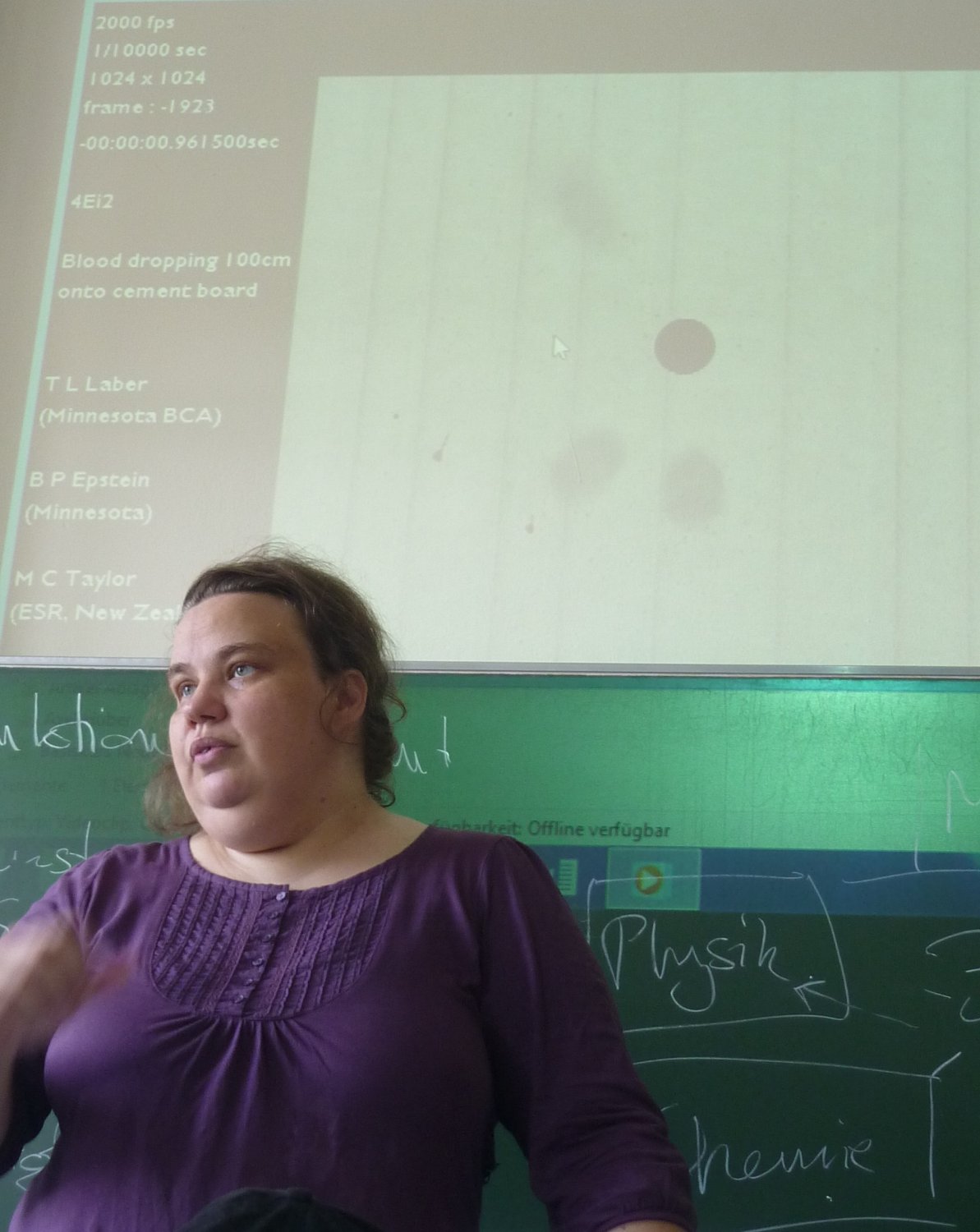 Im Laufe des Vortrags wurde von Frau Brodbeck anschaulich durch Fotos und Filmaufnahmen mit hochauflösenden Kameras dargestellt, wie Blutspuren aufgrund der physikalischen Eigenschaften des Blutes interpretiert werden können.