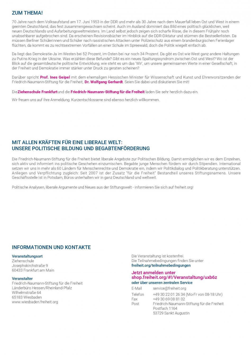 70 Jahre nach dem Volksaufstand am 17. Juni 1953 in der DDR und mehr als 30 Jahre nach dem Mauerfall leben Ost und West in einem geeinten Deutschland, das fest zusammengewachsen scheint. Auch im Ausland dominiert das Bild eines politisch glücklichen, weil neuen Deutschlands und Aufarbeitungsweltmeisters. Im Land selbst jedoch zeigen sich scharfe Risse, die in diesem Frühjahr noch unabsehbarer aufgebrochen sind. Da erscheinen Revisionsbücher im Hinblick auf die DDR-Diktatur und stürmen die Bestsellerlisten. Da müssen Berliner Schülerinnen und Schüler nach rassistischen Attacken unter Polizeischutz aus einem brandenburgischen Ferienlager flüchten, da kommt es zu rechtsextremen Vorfällen an einer Schule im Spreewald, doch die Politik wiegelt einfach ab.