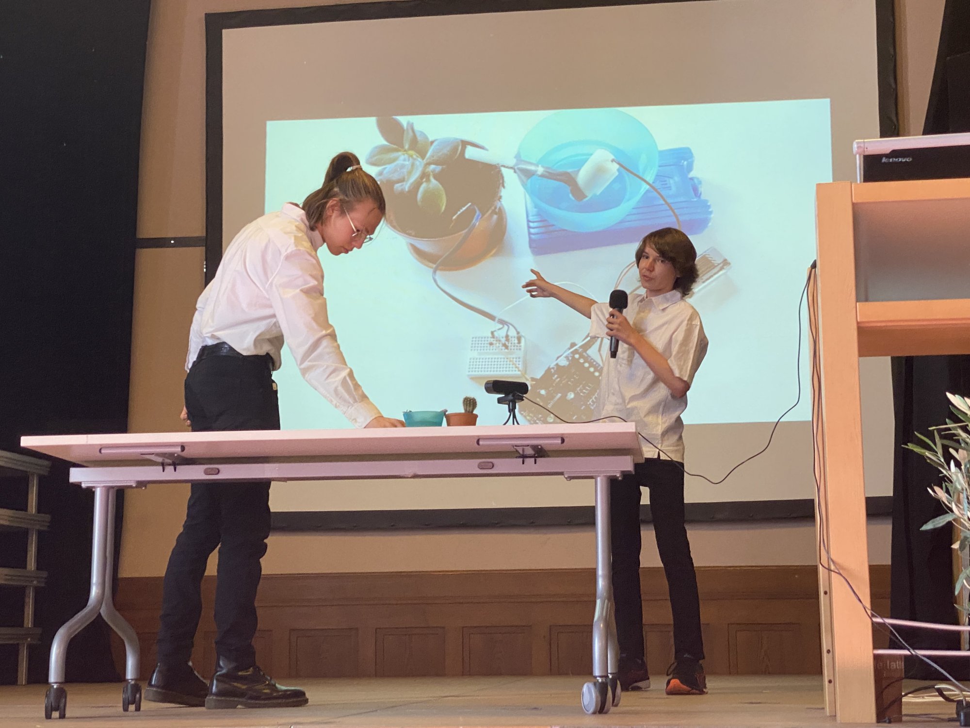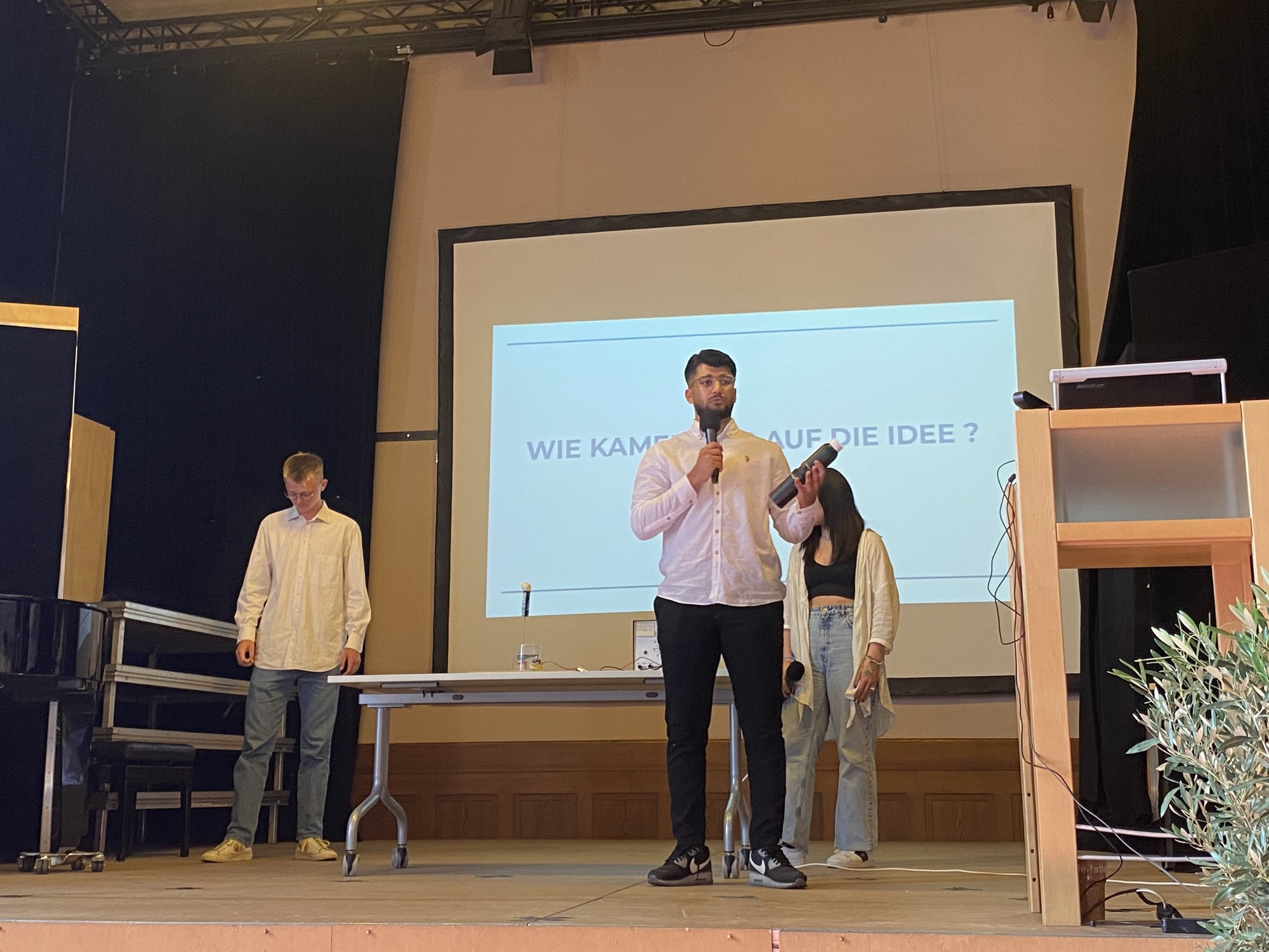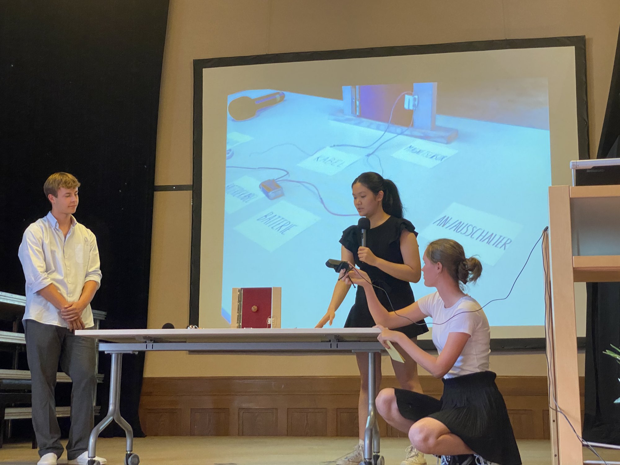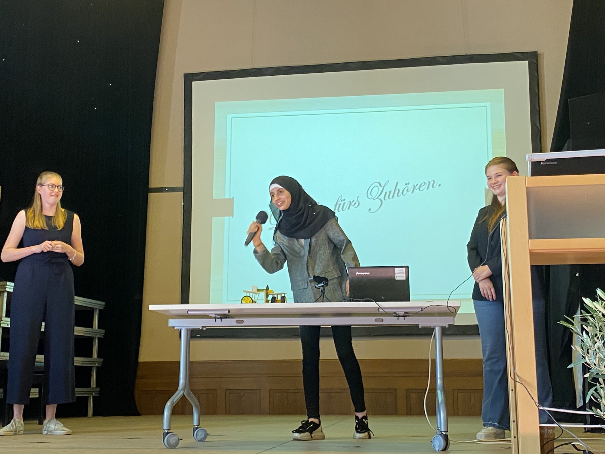 Die Abschlussveranstaltung der diesjährigen Junior - Ingenieur:innen fand unter der Teilnahme von Eltern, Schülerinnen und Schülern und Lehrkräften statt. Zur feierlichen Einstimmung spielte Tiffany Goldstein (Q2) die 7. Novelette von Robert Schuhmann auf dem Piano. Christoph Maitzen, der Fachbereichsleiter der Naturwissenschaften der Ziehenschule, und Tobias König von der Stiftung Polytechnische Gesellschaft Frankfurt, begrüßten das Publikum. Lukas Ziebarth (JIA-Absolvent 2020) führte durch das Programm. Von den jungen Erfinder:innen wurden fünf Projekte vorgestellt, die über das letzte Halbjahr mit vorher erlangtem Wissen in den Bereichen Sensorik, Motorik und Elektronik in Kleingruppen erarbeitet wurden.
