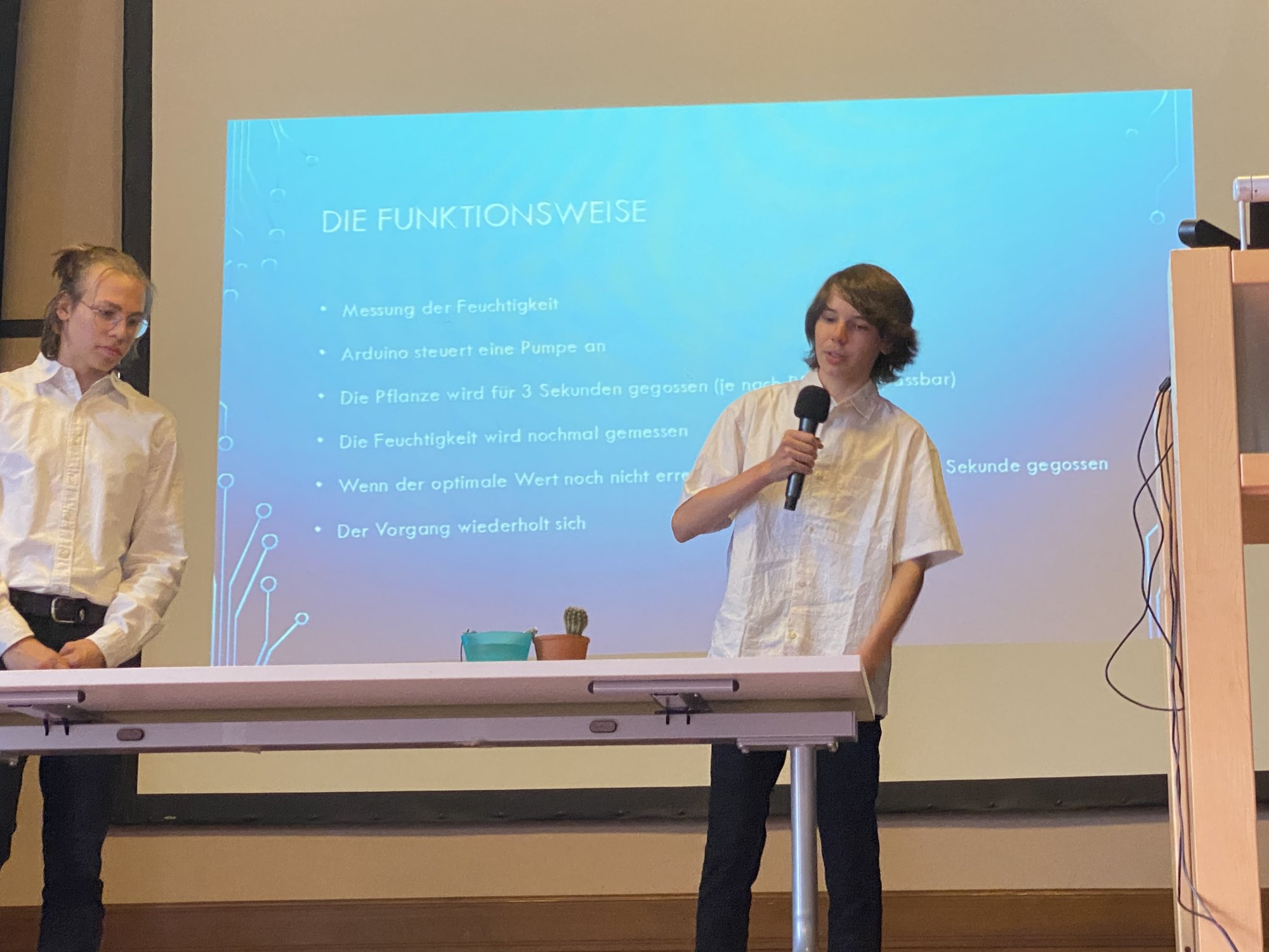 "Bubble Bam" war die erste Vorstellung des Abends und zielt darauf ab, Ihnen das Reinigen von großen Flaschen zu erleichtern. Daraufhin wurde der Zimmeralarm präsentiert, der als Sicherung Ihrer Privatsphäre dient. Weiter ging es mit einer automatischen Bewässerungsanlage, durch die manuelles Gießen überflüssig wird. Eine weitere Automatisierung wurde in Form von einem automatischen Gemüseschneider präsentiert, bevor die Vorstellung des Dynamoladekabels folgte.