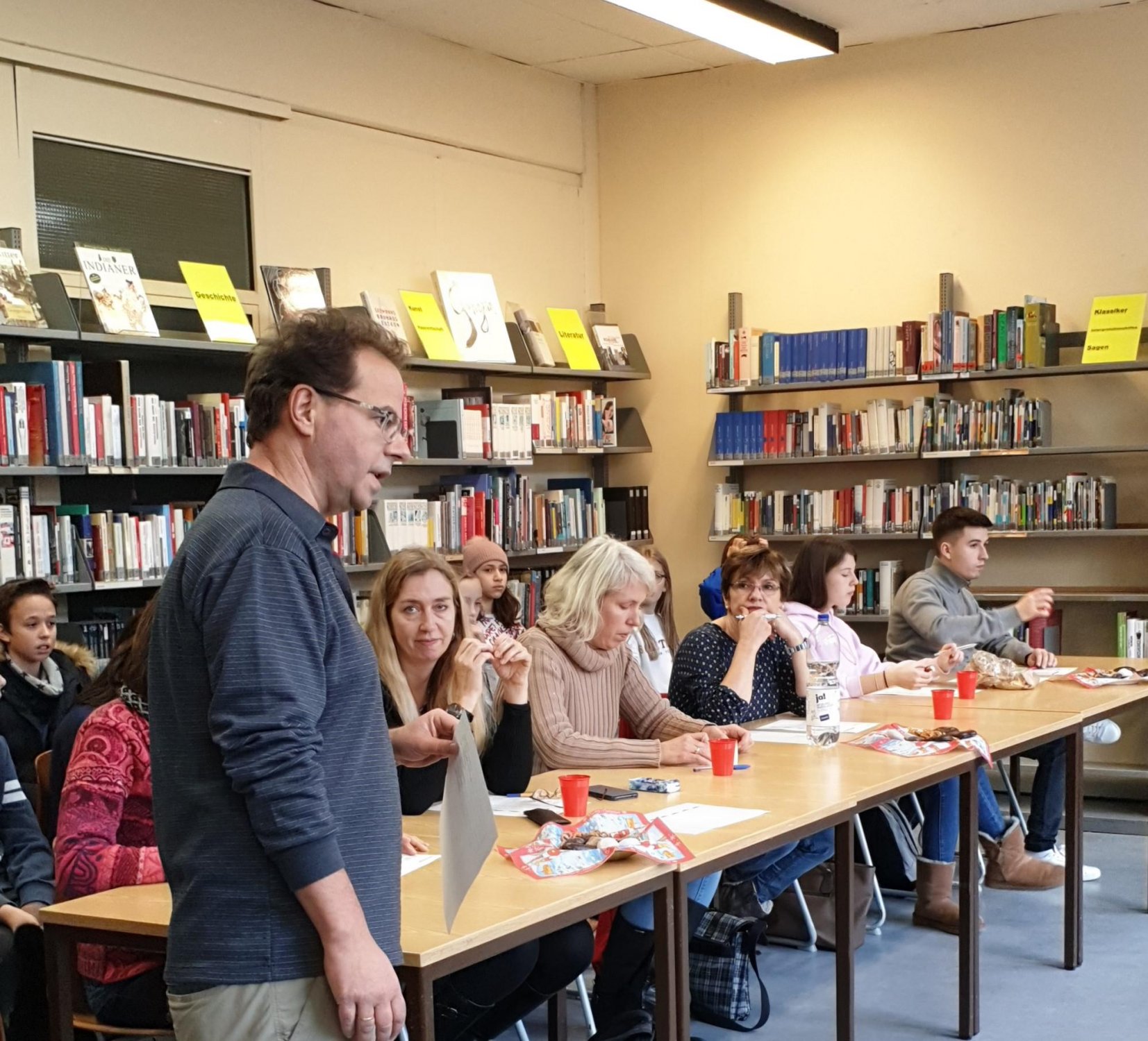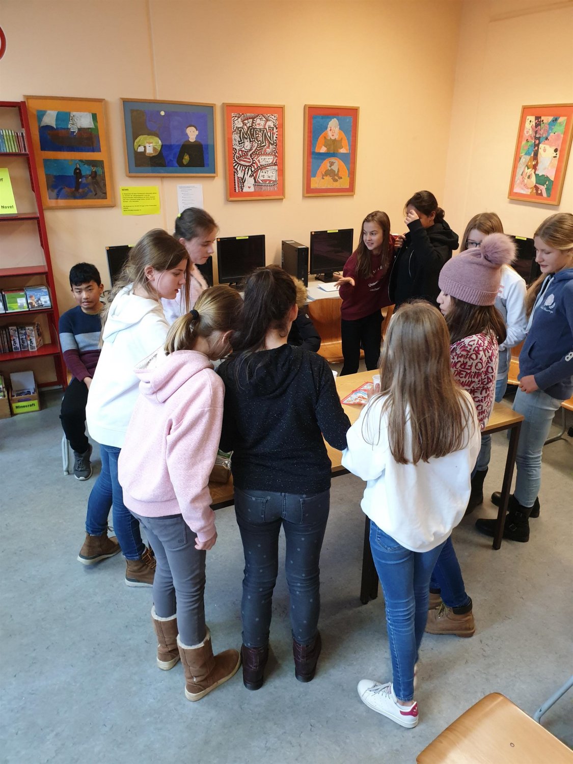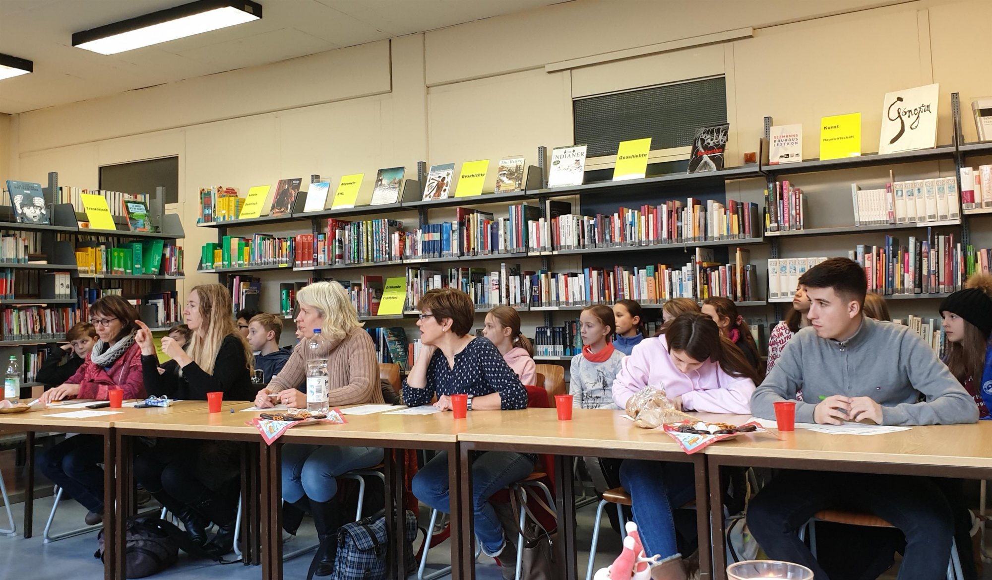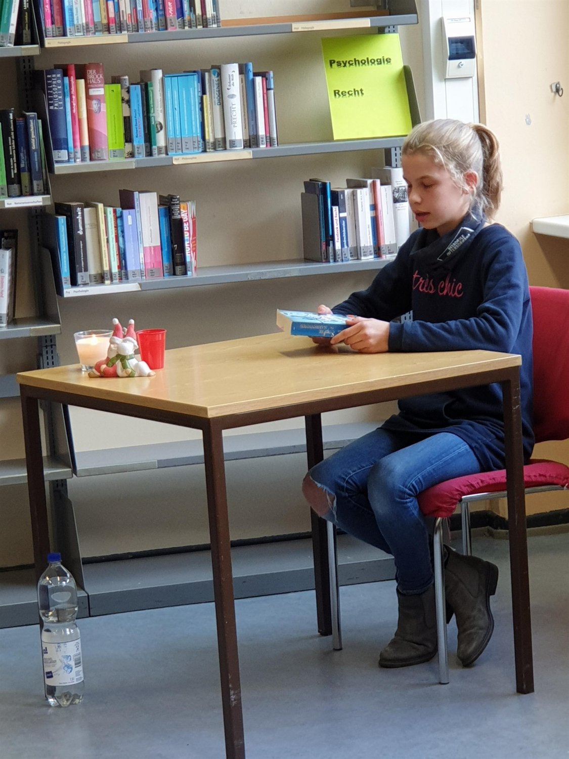 Leuchtende Augen, rote Wangen, Aufregung pur!! Am Dienstag, dem 10. Dezember 2019, um die Mittagszeit ging der Vorlesewettbewerb der Jahrgangsstufe 6 in den Räumlichkeiten der Schülerbücherei unter der Leitung des Deutschlehrers Herrn Hirsch über die Bühne: Zehn Sechstklässler/innen - je zwei Schüler/innen aus den fünf 6. Klassen - präsentierten in einer dreiminütigen „Lesung“ Auszüge aus ihren Lieblingsbüchern: Schaurig-Gruselig- Phantastisches, Witzig-Amüsantes-Unterhaltsames wurde dem Publikum und der Jury dargeboten. Im Publikum saßen zwanzig beste Freundinnen und Freunde aus der eigenen Klasse zur „moralischen“ Unterstützung, die Jury bestand aus zwei Schüler/innen der Oberstufe, zwei ehrenamtlichen Mitarbeiterinnen der SchüBü und zwei Lehrkräften: Aufmerksam wurde beobachtet, ob die Texte möglichst fehlerfrei und lebendig vorgetragen werden, ob die „Vorleser/innen“ sich möglichst textgetreu in die Figuren ihrer Wahl einfühlen können. Im Anschluss dann die zweite „Lese-Runde“ mit erhöhtem Schwierigkeitsgrad: Aus einem beliebten Jugendroman musste ein unbekannter Text vorgelesen werden. Dies erforderte höchste Konzentration und „Mucksmäuschenstille“!