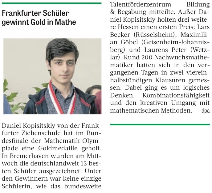 Daniel Kopisitskiy (Klasse 9a) gewinnt Goldmedaille in der Mathematik-Olympiade!