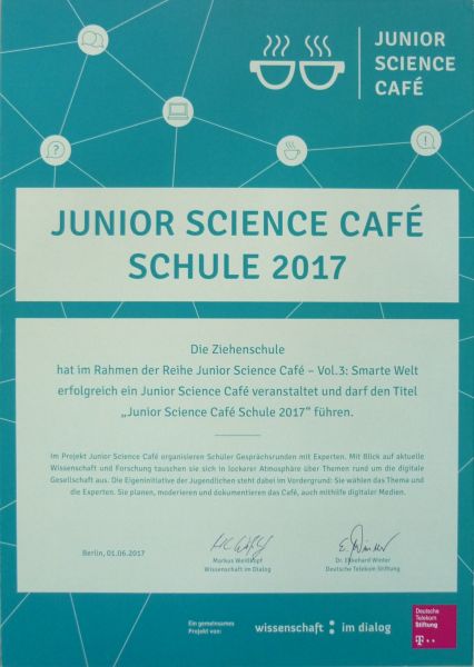 Die aus Berlin angereiste Projektleiterin Dr. Ursula Resch-Esser übergab am Ende der Veranstaltung an die Schülerinnen und Schülern der AG Junior Science Café Urkunden. Die Ziehenschule wurde als „Junior Science Café Schule 2017“ ausgezeichnet.