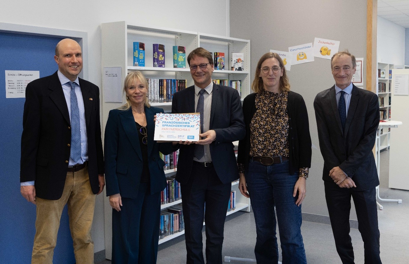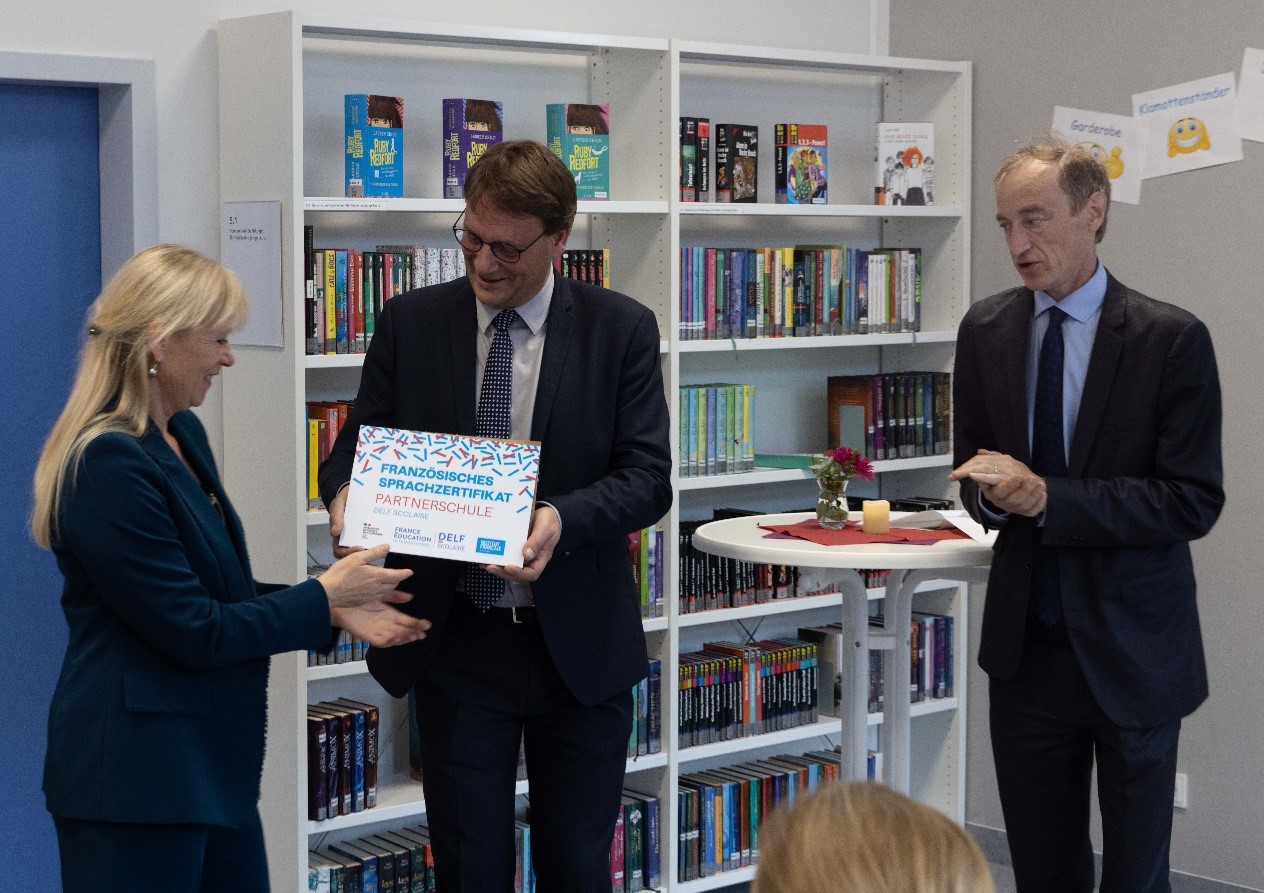 Überreichung der DELF-Plakette. Von links nach rechts: Frau Rogler, Herr Beaufils (Institut français Düsseldorf), Herr Buffin (Generalkonsulat der Französischen Republik in Frankfurt).