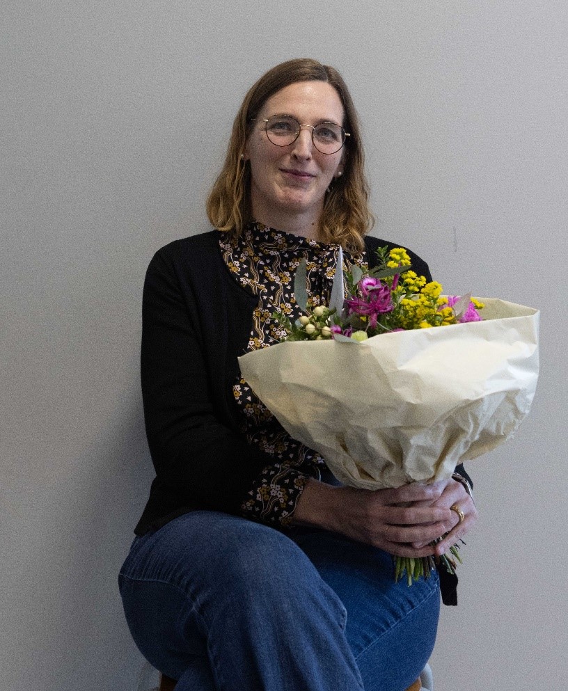 Frau Mercker mit Blumenstrauß.