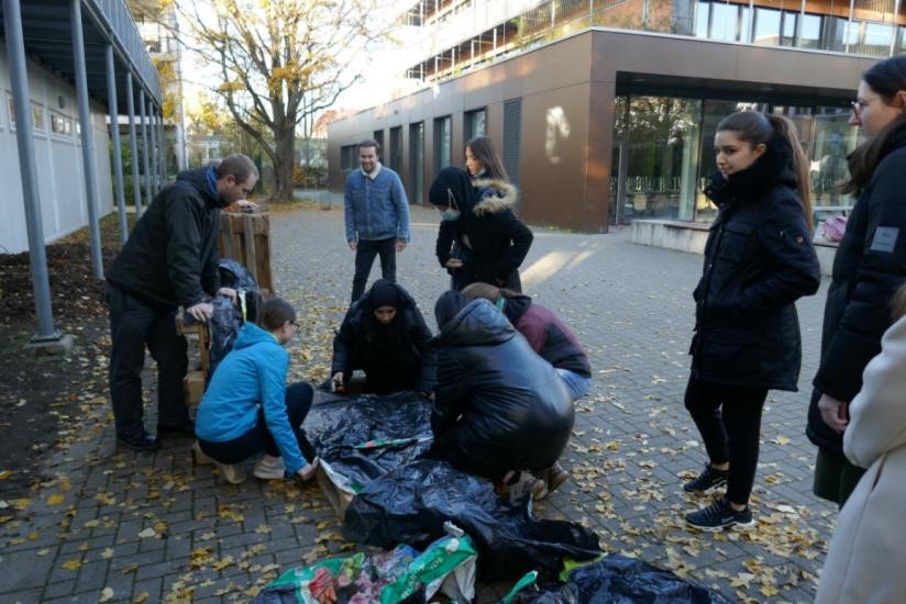 Am Mittwoch, den 23.11.22, besichtigten Student/inn/en der Fachschaft Biologie der Goethe-Universität Frankfurt den Schulgarten. In einer Führung wurden Sie über Projekte und Ressourcen schonendes Arbeiten (z.B. Kompostieren) im Schulgarten informiert. Unter anderem wurden auch Aspekte zu nachhaltiger Bewirtschaftung (Verwendung von eigenem Häcksel als Dünger) besprochen. Da dies im Rahmen eines Fachdidaktik-Kurses zum Thema „Der Schulgarten im Winter“ stattfand, wurden vor allem aktuelle Aufgaben, die in der kalten Jahreszeit im Garten anstehen, vorgestellt. Abschließend wurde ein Hochbeet aus Holzpaletten und Folien zusammengebaut, das im Frühjahr „begrünt“ werden soll.