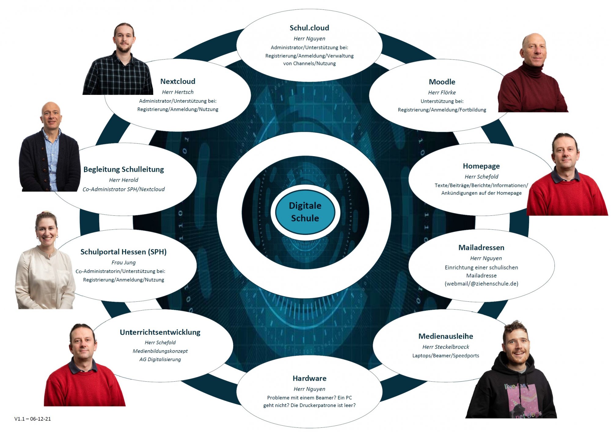 Wie kann das Lehren und Lernen an der Ziehenschule unter den Bedingungen der Digitalisierung nachhaltig gestaltet werden? Mit dieser Fragestellung setzen sich viele Mitglieder der Schulgemeinde auseinander. Zur Steuerung dieser Gestaltungsaufgaben gibt es Arbeitsgruppen und Ansprechpartner. Ein paar Gesichter aus dem Bereich "Digitale Schule" möchten wir Ihnen mit diesem digitalen Kompass vorstellen.