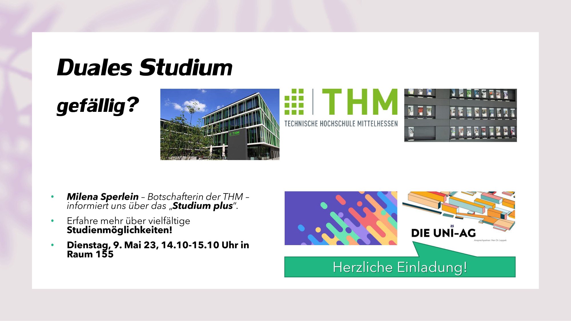 Erfahre mehr über vielfältige Studienmöglichkeiten! Milena Sperlein ist Botschafterin der Technischen Hochschule Mittelhessen und informiert über das "Studium plus".
