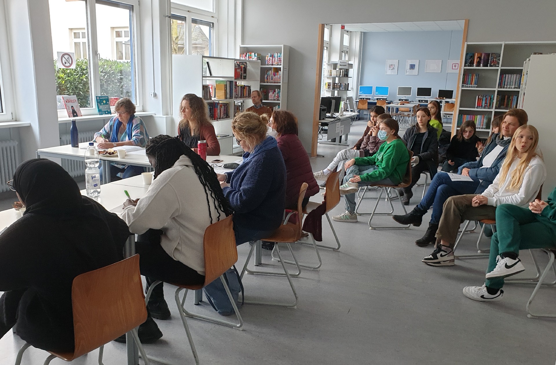 Noch bevor der eigentliche Wettbewerb startete, war eine Sache schon klar: Hier treffen nur Sieger:innen aufeinander. Darauf hat in einer lockeren und ermutigenden Eingangsrede die Vorjahressiegerin unserer Schule – Laura Teppe (7e) – aufmerksam gemacht. Denn schließlich hatten sich alle Vorleser:innen des Tages in ihren Klassen zuvor durchsetzen und auf diese Weise für den so genannten Schulentscheid in unserer Schülerbücherei qualifizieren müssen.