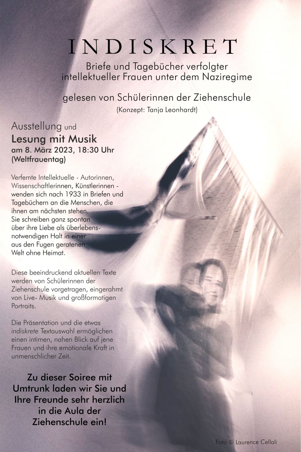 Am Abend des 8. März, dem 112. Weltfrauentag, fand in der Aula der Ziehenschule die Lesung „Indiskret“ statt. Die vorgelesenen Texte stammen von sieben berühmten Künstlerinnen und Denkerinnen, wie z.B. Hannah Arendt, Mascha Kaléko oder Käthe Kollwitz, und wurden von Schülerinnen der Oberstufe interpretiert. Bei den gelesenen Auszügen handelt es sich aber nicht um redigierte Werke der Frauen, sondern um private Tagebucheinträge und Briefwechsel, die einen „indiskreten“ Einblick in das vom Nationalsozialismus erschütterte (Gefühls-)Leben der Frauen geben.