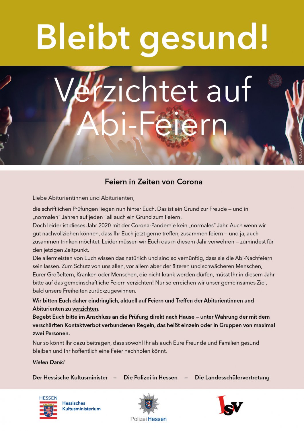 Wir bitten Euch daher eindringlich, aktuell auf Feiern und Treffen der Abiturientinnen und Abiturienten zu verzichten.