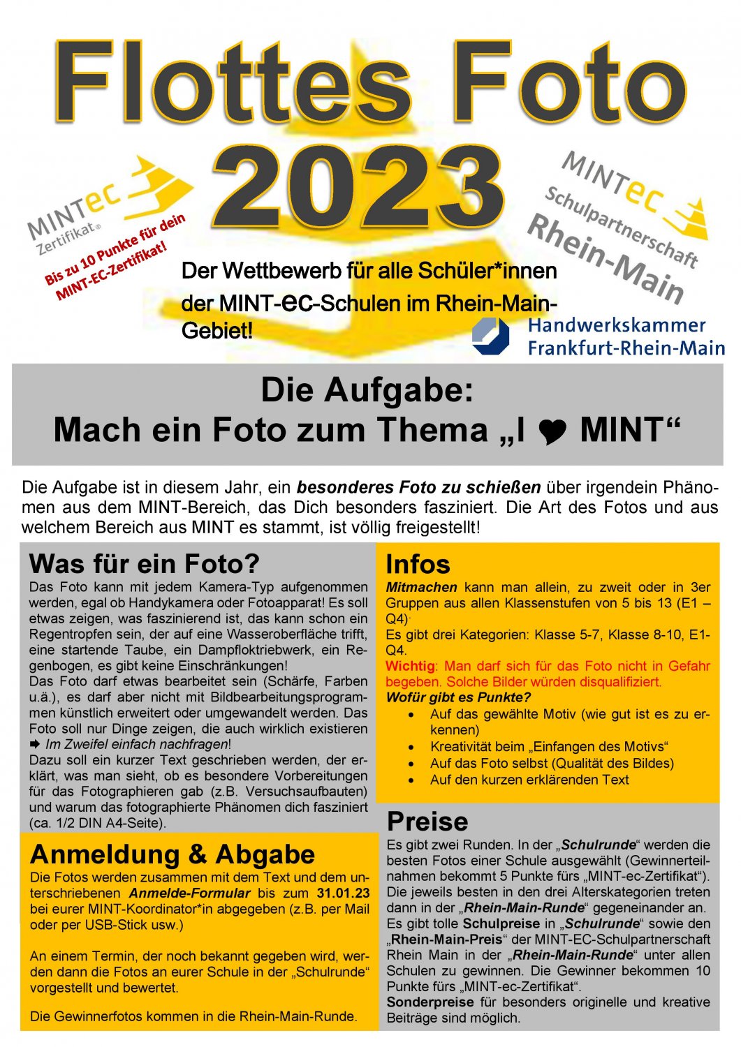 Schießt ein besonderes Foto über ein Phänomen aus dem MINT-Bereich, das dich besonders fasziniert. Die Art des Fotos ist völlig freigestellt und das Foto kann aus dem Bereich der Naturwissenschaften Biologie, Physik oder Chemie, aus der Mathematik oder aus dem Informatik- oder Technikbereich stammen. Außerdem musst du beschreiben, was deine Idee war, warum dich gerade dieses Phänomen fasziniert und du solltest die naturwissenschaftlich-technischen Hintergründe des Fotos erklären. Hierzu findest du Platz auf dem Anmeldeformular, das du mit dem Foto abgibst.