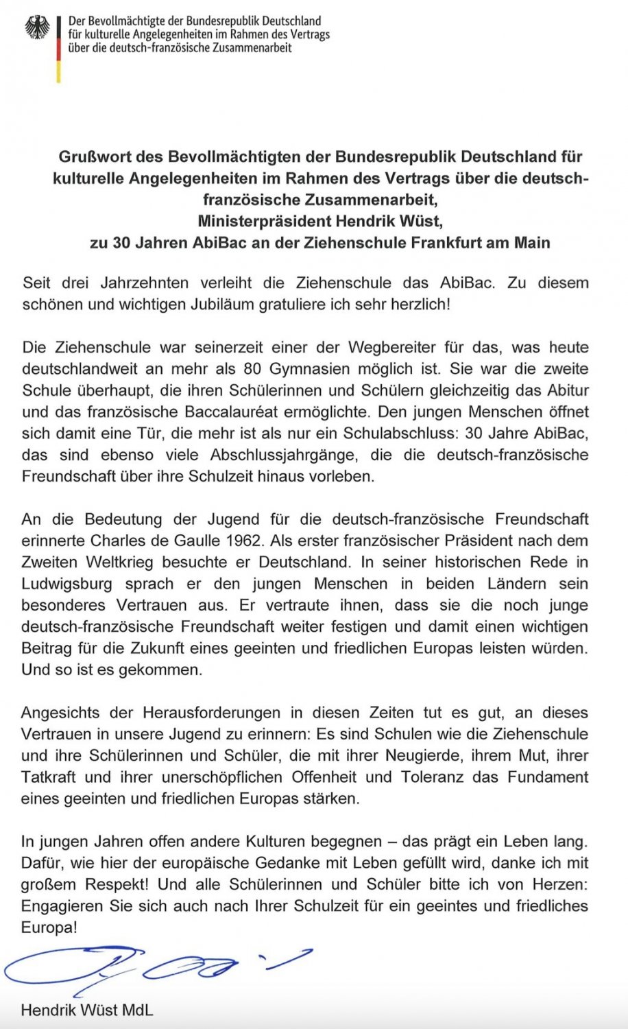 - Grußwort zum AbiBac-Jubiläum des Bevollmächtigten der Bundesrepublik Deutschland für kulturelle Angelegenheiten im Rahmen des Vertrags über die deutsch-französische Zusammenarbeit, Ministerpräsident Hendrik Wüst MdL
