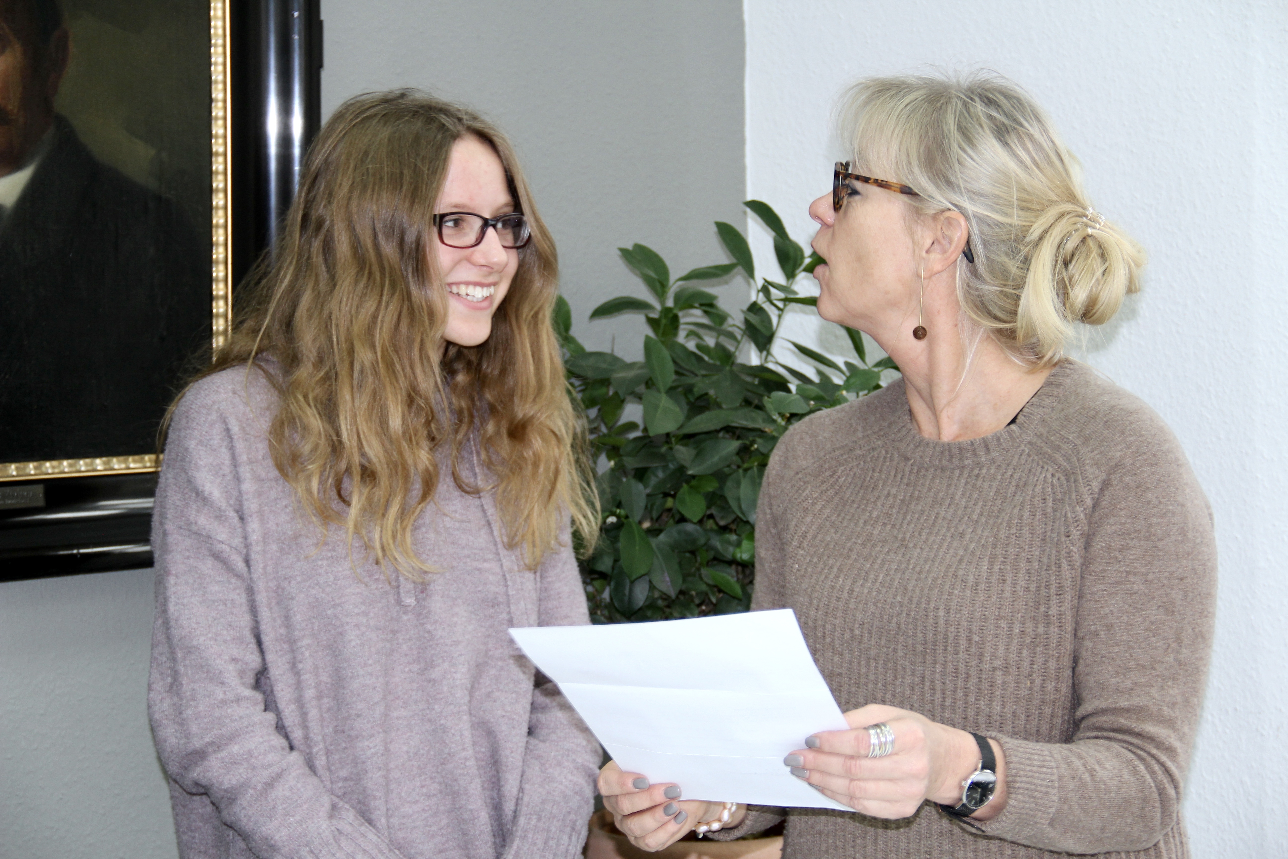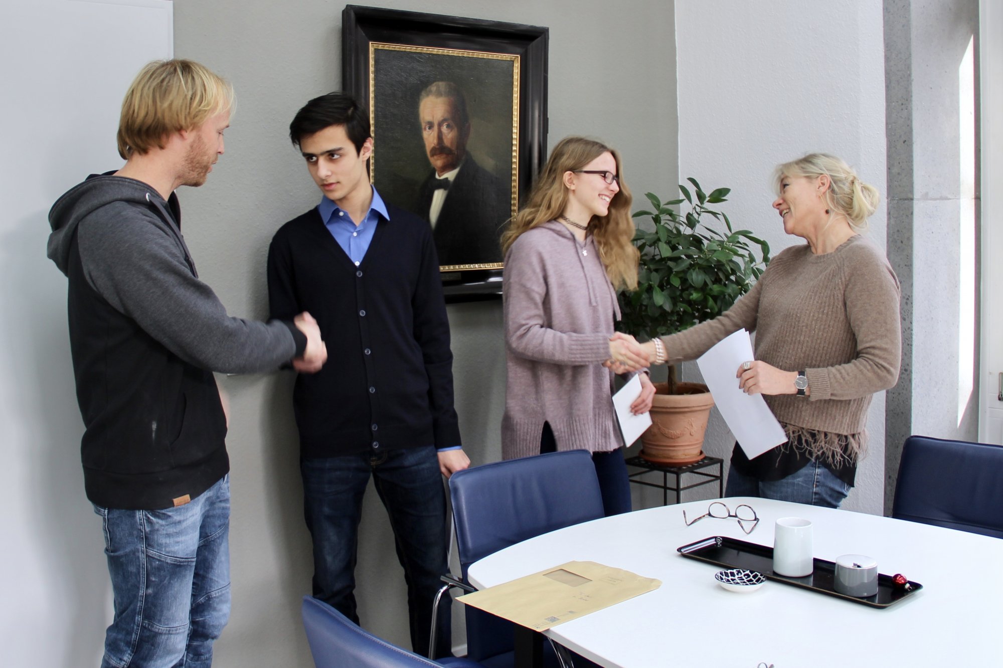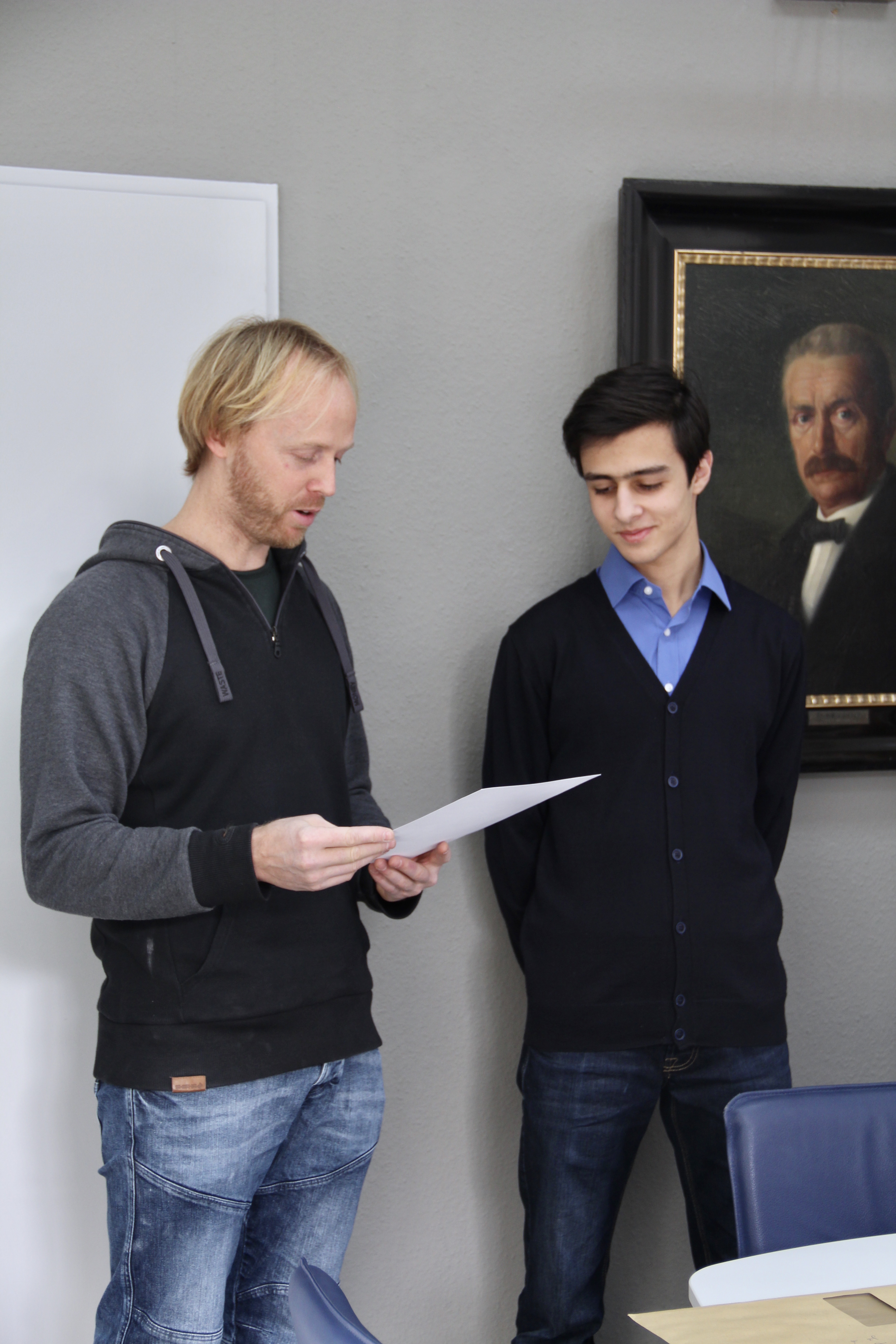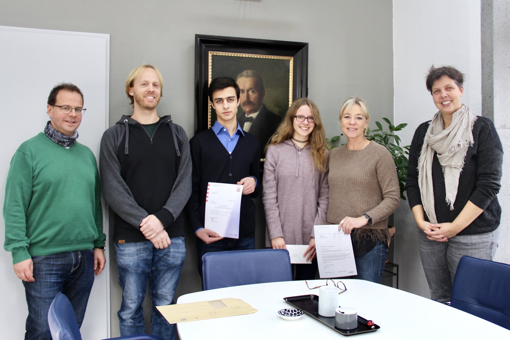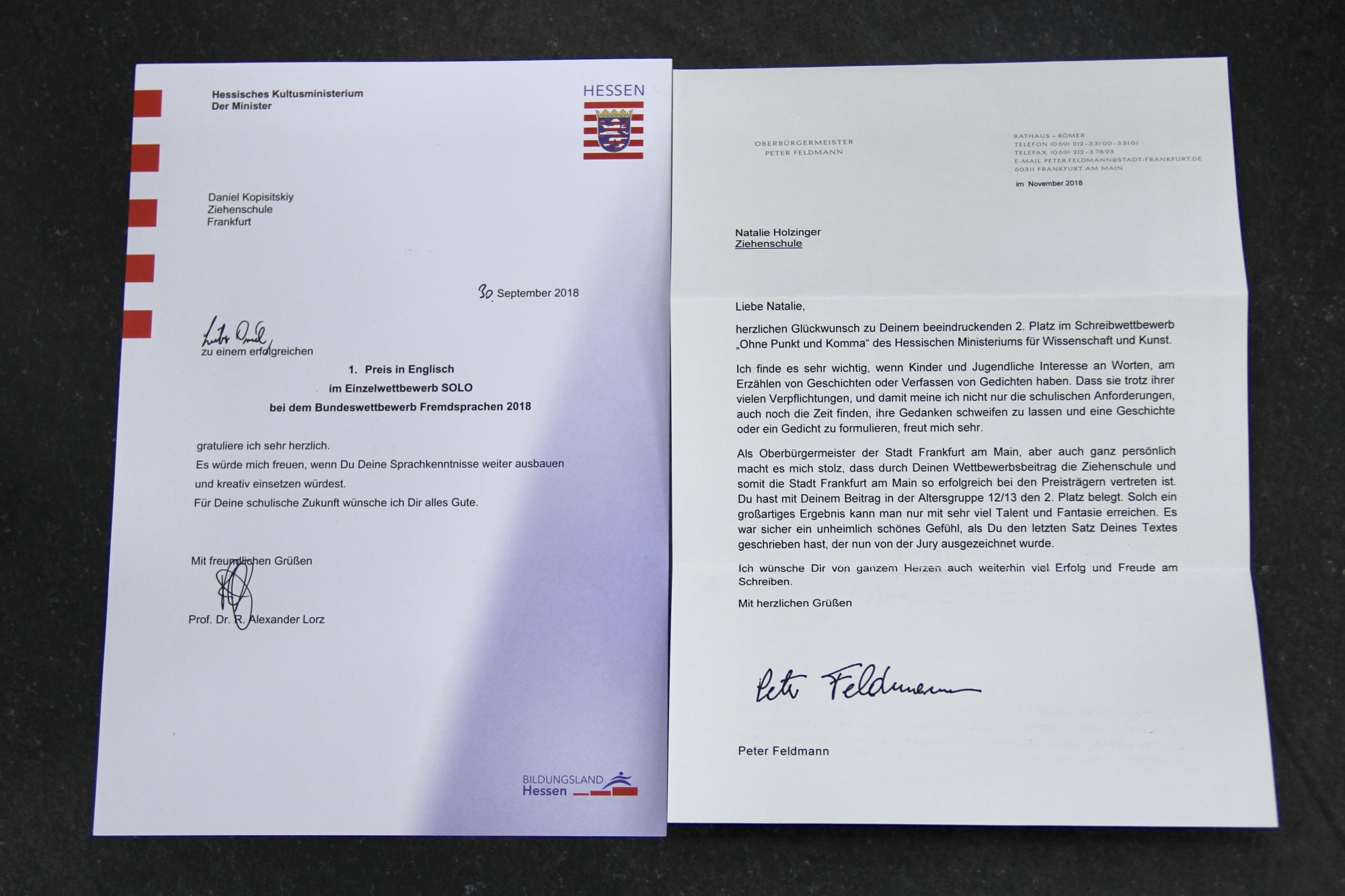 Die Gratulationen erfolgten für Daniel im Namen des Hessischen Kultusministers Prof. Dr. Alexander Lorz und für Natalie im Namen des Oberbürgermeisters Peter Feldmann. Die Schulleiterin der Ziehenschule, Frau Christiane Rogler, überreichte die Dokumente.