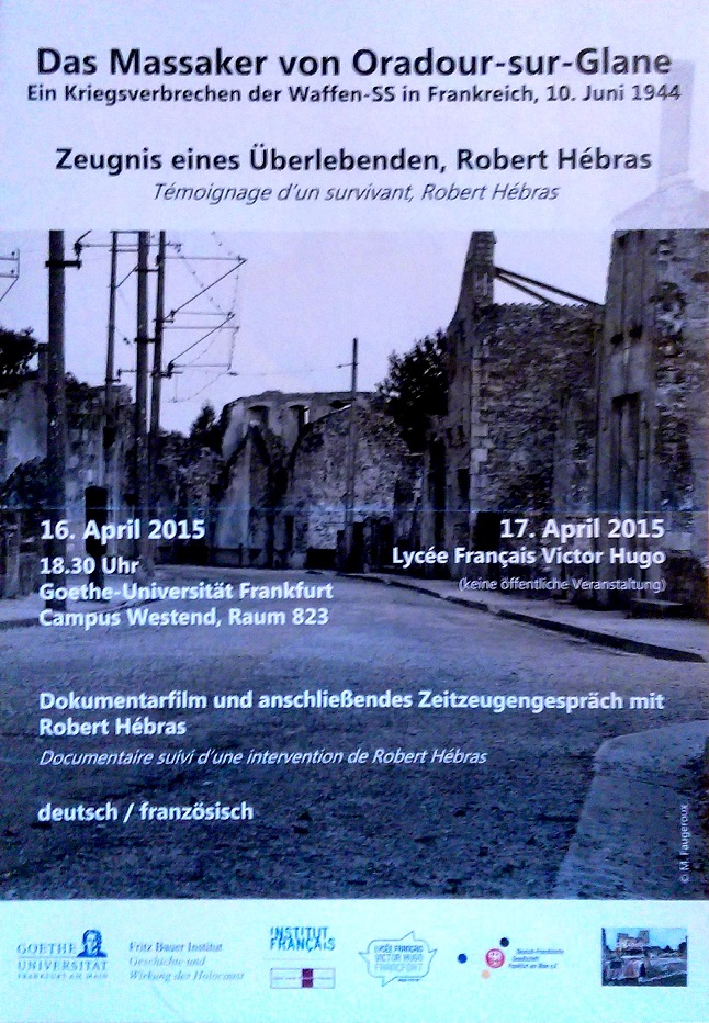Am Freitag nach den Ferien hatten wir, die Schüler des Leistungskurses Französisch der Stufe 11 unter Leitung von Frau Mercker und Herrn Schleif, die Möglichkeit, an der französischen Schule „Lycée Victor Hugo“ einen Zeitzeugen eines gegen Kriegsende stattgefundenen Nazi-Massakers zu treffen. Da dieses Thema immer wieder zum Zentrum des Geschichtsunterrichts an der Ziehenschule gehört und speziell im nächsten Halbjahr wieder wichtig wird, war es eine ideale Gelegenheit, uns Schüler die Aspekte des Naziregimes nacherleben zu lassen. Nach einer relativ langen Fahrt mit der U-Bahn kamen wir an der Schule an, die uns direkt durch ihre Modernität und einen netten Empfang auffiel. Der Saal, in dem das Interview stattfand, war ebenso modern und obwohl der mittlerweile 89-jährige Zeitzeuge sehr leise sprach, konnten wir ihn sehr gut verstehen. Auch war das Ereignis ein gutes Training für unser Französisch, denn Robert Hébras stammt aus dem südlichen Frankreich und spricht kein Deutsch. Das Massaker, das Herr Hébras miterlebt hat, fand am 10. Juni 1944, also vier Tage nach dem „Débarquement“ der Alliierten in der Normandie, in dem Dorf Oradour-sur-Glane statt. Mitglieder der 2. SS-Panzer-Division „Das Reich“ töteten hier auf bestialische Weise 642 Dorfbewohner. Ihre typische Vorgehensweise hatte die Panzer-Division zuvor bei ihren Einsätzen an der Ostfront perfektioniert.