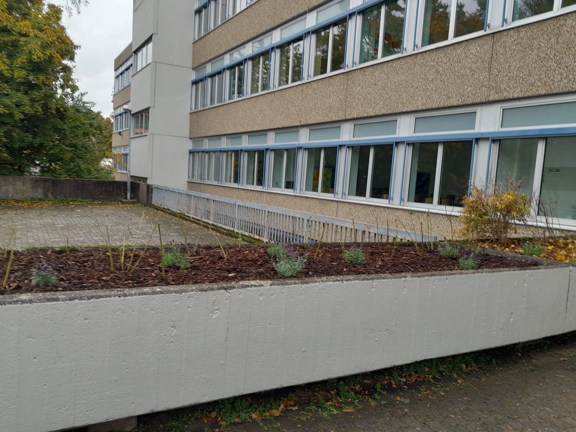 Am Samstag, den 15.10.22, wurde im Rahmen eines Aktionstages gemeinsam mit Eltern der Klasse 8c und Herrn Grommet damit begonnen, Rosenbeete mit Arten einer trockenheitsresistenten Flora aus dem Mittelmeerraum am Eingang der Schule zu erneuern. Dies hat den Vorteil, dass das Beet relativ pflegeleicht wird und vor allem im Sommer weniger Wasser benötigt. Es wurde zunächst winterharter Lavendel eingesetzt, weitere (sub-)mediterrane Arten werden hier im kommenden Frühjahr folgen.