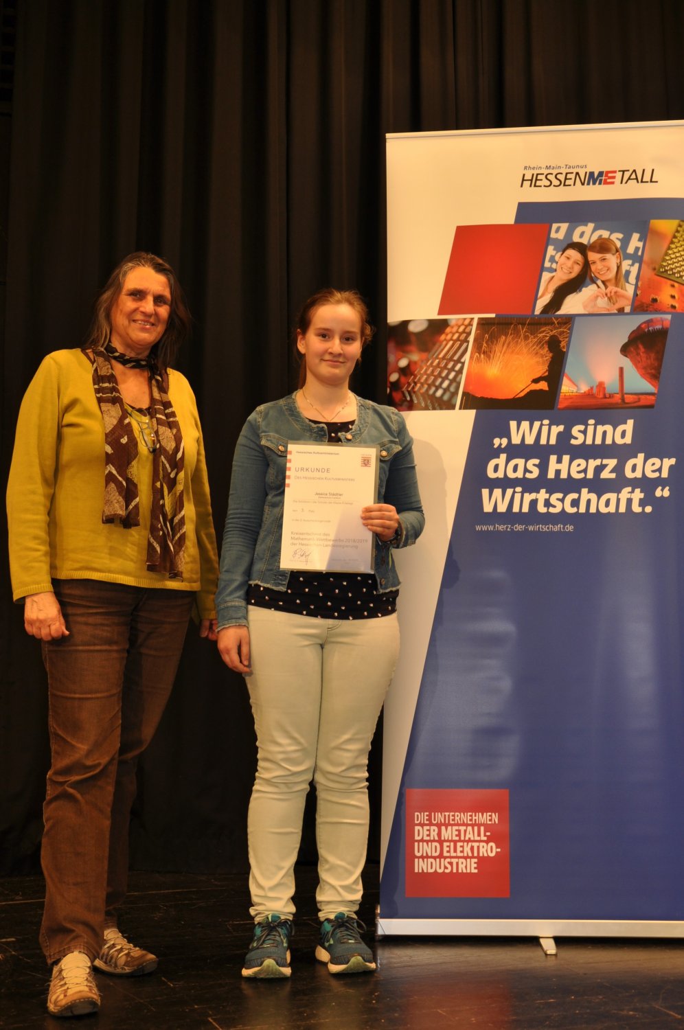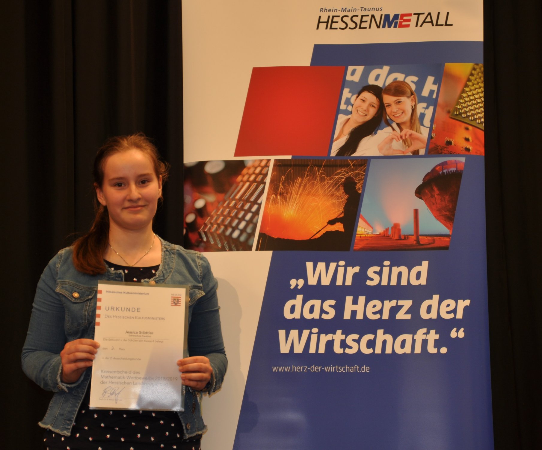 Von den 7 Schulsiegern der Ziehenschule gelang es Jessica Städtler, sich für die 3. Runde des Mathematik-Wettbewerbs der 8 Klassen zu qualifizieren. Jan Genadiev, der in der 1. Runde noch klar vor Jessica lag, verpasste dieses Ziel nur knapp. Jessica wurde hierfür am 7. Mai in Wiesbaden geehrt und erhielt auch Preise. (Bild)