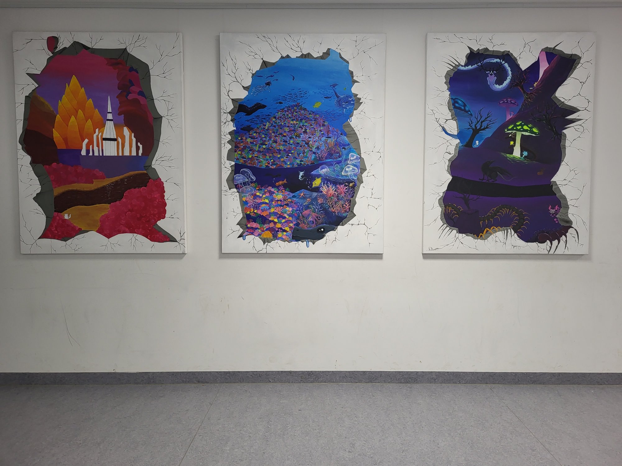 Die Gemälde auf den drei Leinwänden zeigen Durchbrüche in Fantasiewelten für all diejenigen, die sich im Schulalltag gerne mal kurz wegträumen wollen. Sie basieren auf Skizzen von K Burger (Schüler des Kunst-LK Q1) und wurden in beeindruckender Teamarbeit an zahlreichen Nachmittagen gemalt.
