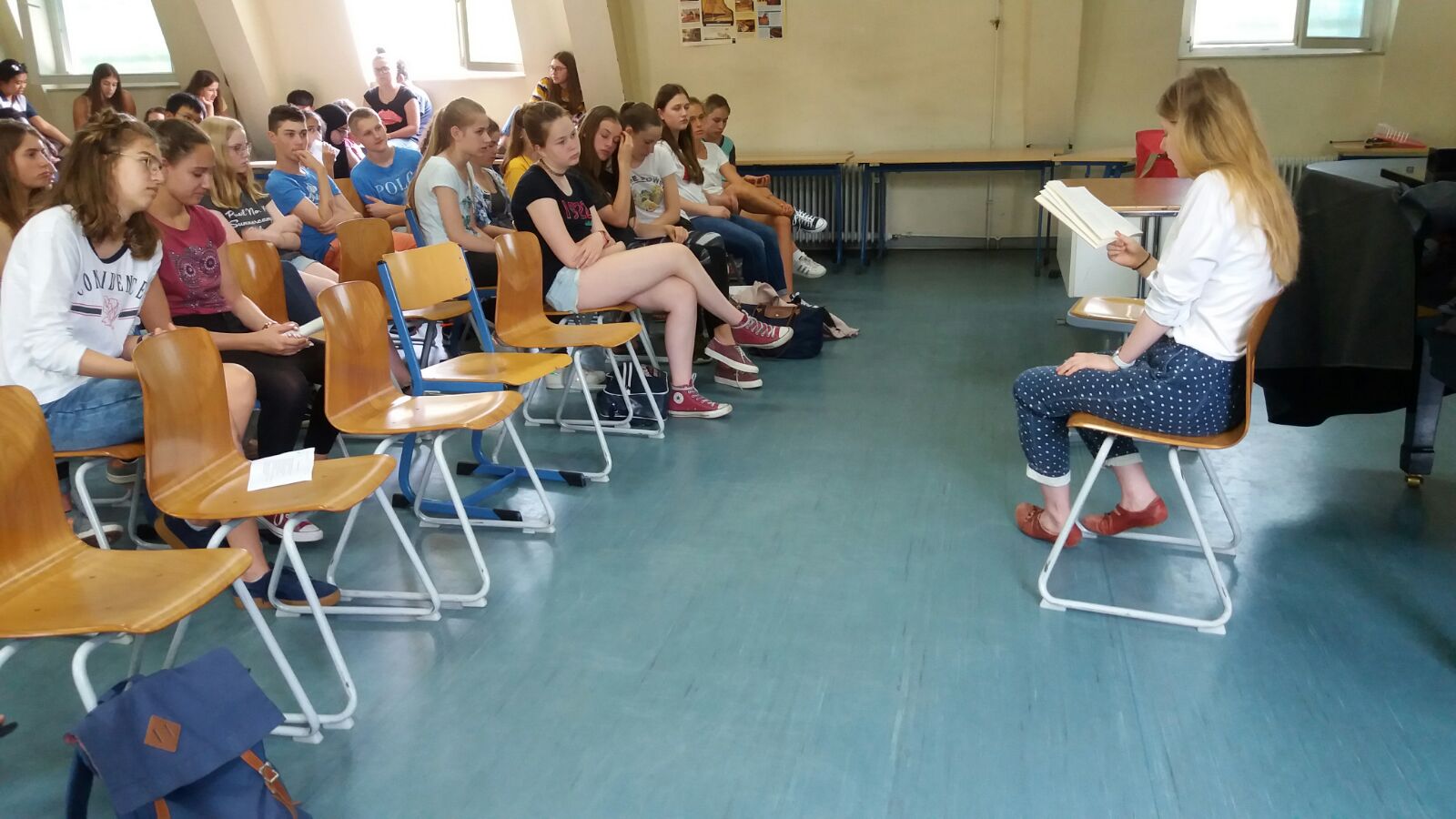 Anschließend durften wir Fragen stellen, welche wir in einer Deutschstunde vorbereitet hatten. So erfuhren wir, dass Lea Lina Oppermann zwei Jahre an dem Roman gearbeitet hat. Die Hälfte der Zeit habe sie zum Korrekturlesen und Überarbeiten gebraucht. Die Idee zu dem Roman sei ihr bei einem Amok-Alarm in ihrer eigenen Schule gekommen, bei dem aber zum Glück nichts passiert sei. Außerdem verriet die Autorin, dass sie gerade an einem zweiten Buch arbeite. Wie es heißen und wann es erscheinen soll, ließ sie aber offen.
