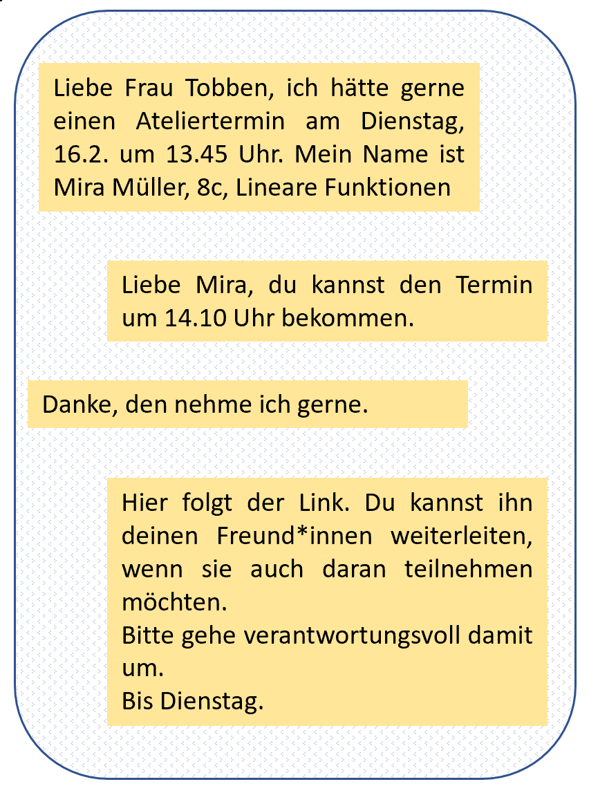 - Du sendest per Schulcloud eine Nachricht an die entsprechende Lehrkraft (max. 6 Tage im Vorfeld): Betreff: Atelier/Name/Klasse/Thema