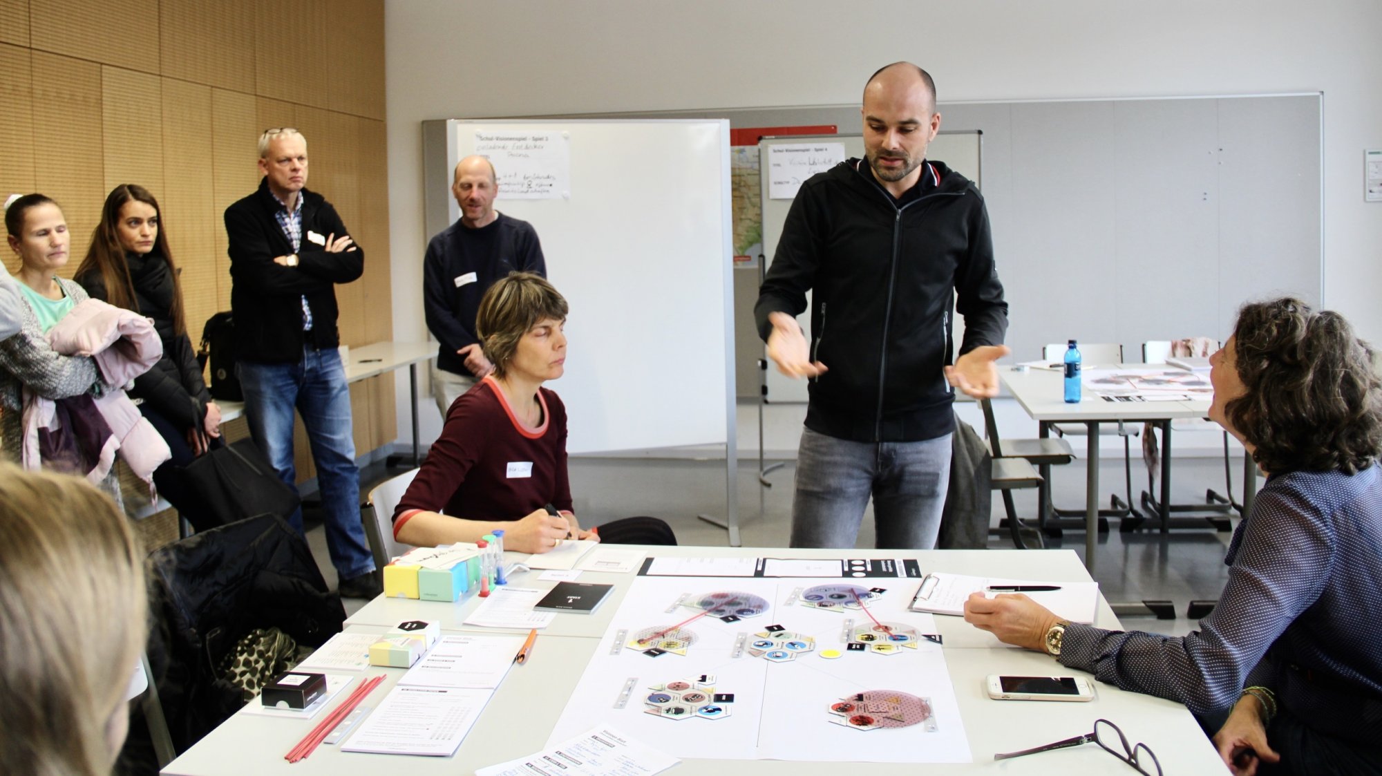Eine beeindruckende Schulhistorie mit der Aula als Herzstück, dem inspirierenden Schulgarten und einem Lehrerkollegium, das mit Leidenschaft und viel Herzblut ein vielfältiges Angebot für die Schülerinnen und Schüler schafft – die Ziehenschule hat viel zu bieten und insbesondere in diesen Punkten waren sich die Teilnehmer des Pädagogischen Tages in Bezug auf die Stärken der Schule einig. Das Architektenteam von den „Berliner Baupiloten“, das den Tag organisierte, wollte sich ein Bild von der Schule machen und erfahren, wie sich Schülerinnen und Schüler, Eltern, Lehrkräfte und Verwaltungsangestellte eine künftige neue Schule vorstellen. Mit Blick auf eine pädagogische Konzeption zum Um- und Neubau der Ziehenschule wurden diese Fragen in sieben zufällig zusammengestellten Teams im Rahmen eines eigens entwickelten Schul-Visionenspiels geklärt. Die Teams erarbeiteten in 17 Spielschritten ein Grundkonzept und eine Rahmenvision ihrer neuen Schule. Auch die Schülerinnen und Schüler, die Teil des Pädagogischen Tages waren, durchliefen das Visionenspiel als eigenes Team. Zum Abschluss eines für die Teilnehmer interessanten und inspirierenden Tages wurden die unterschiedlichen Ergebnisse vorgestellt und erläutert.