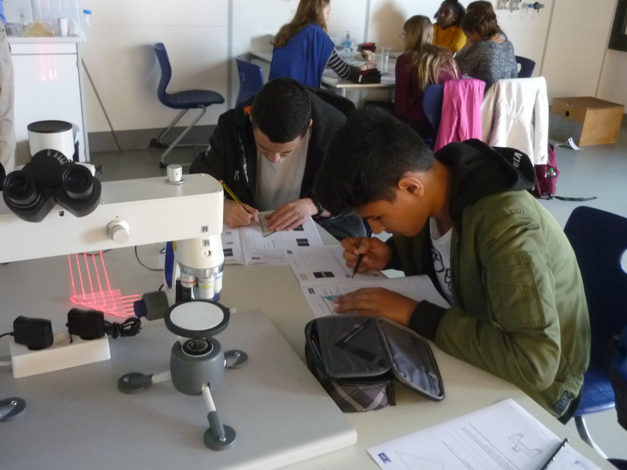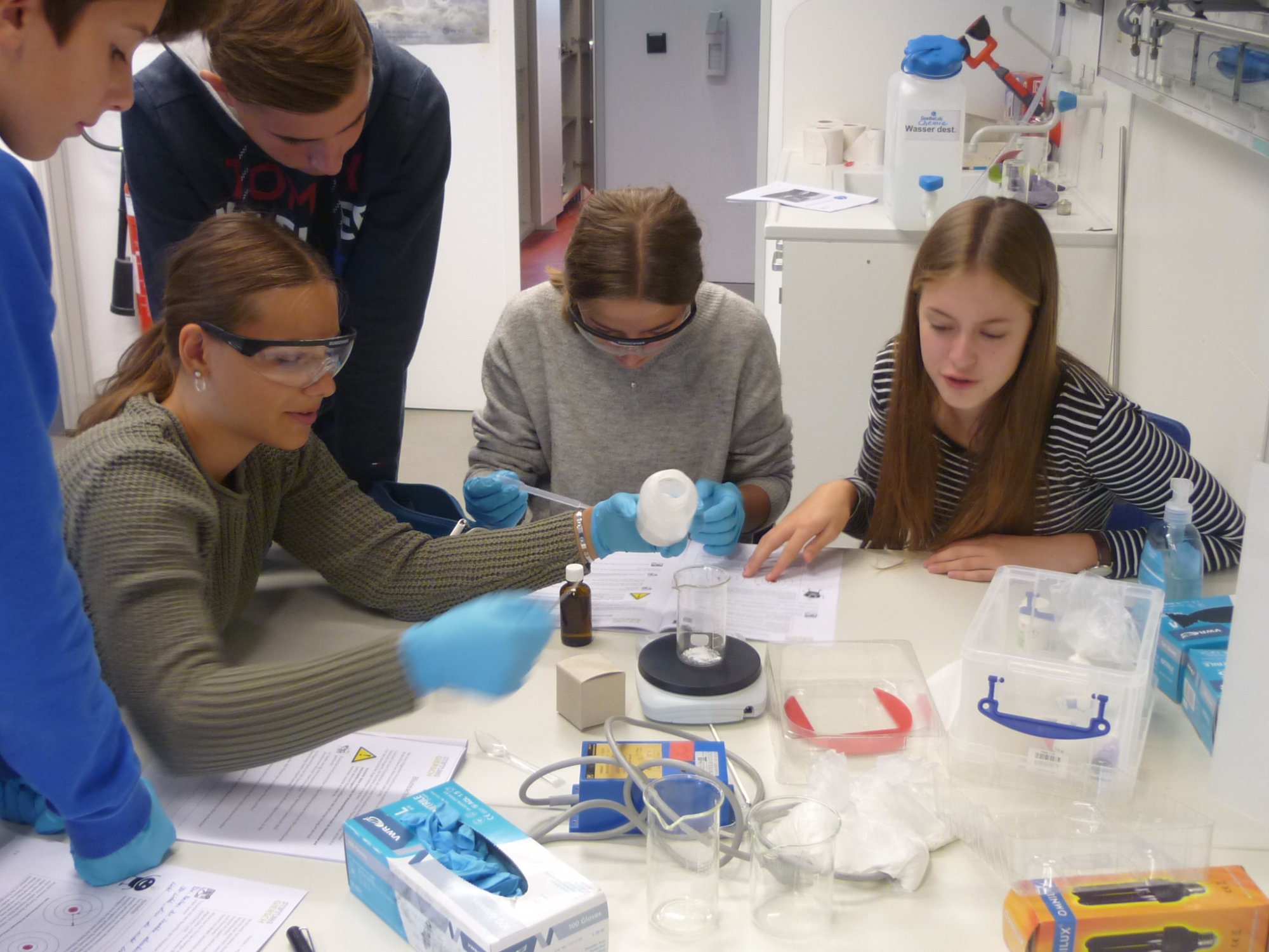 Zwei Schultage später ging es für den Wahlpflichtkurs Naturwissenschaften 9 auf Verbrecherjagt zum Schülerlabor „Kriminalistik“ des Fachbereichs Physik der Frankfurter Universität. Am Beispiel eines fiktiven Mordfalls haben die Schülerinnen und Schüler an fünf Stationen, die am Tatort gefundenen Spuren analysiert und ausgewertet: