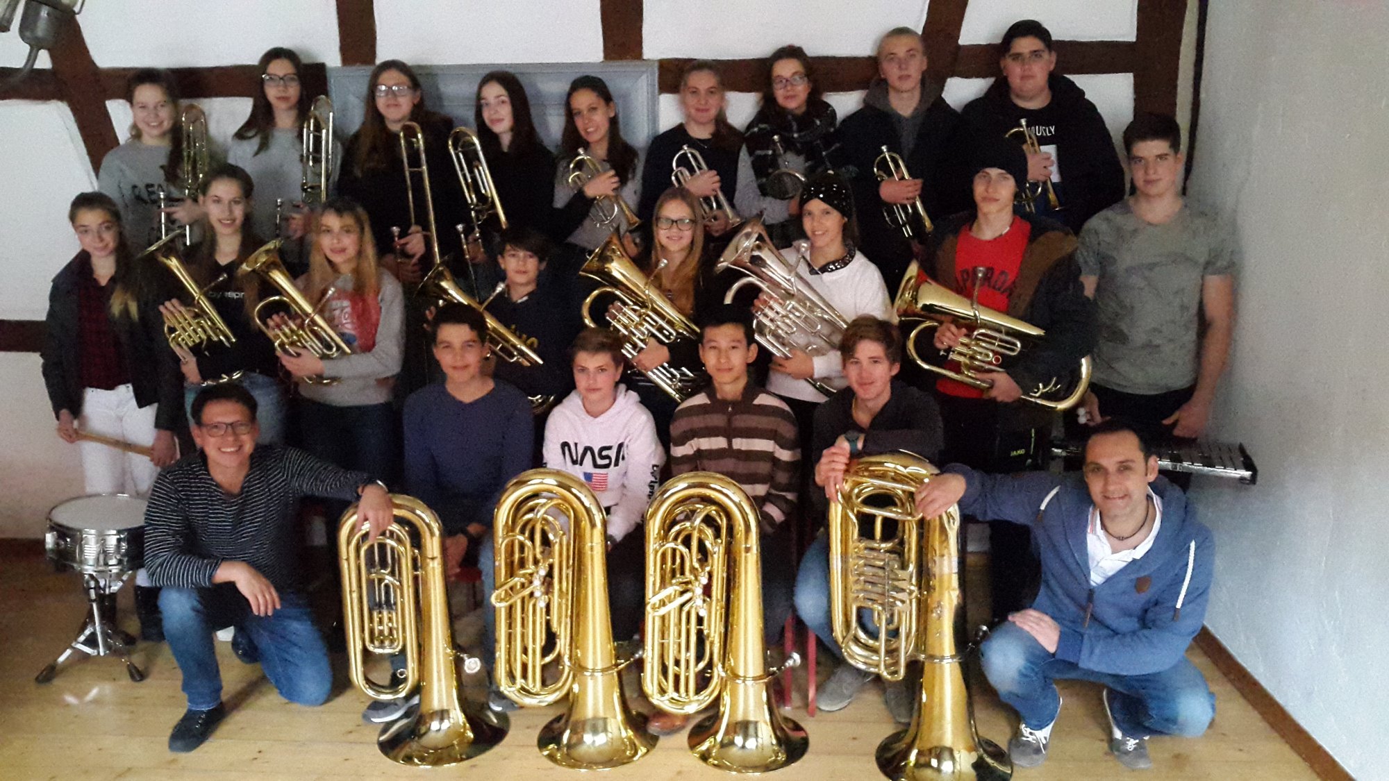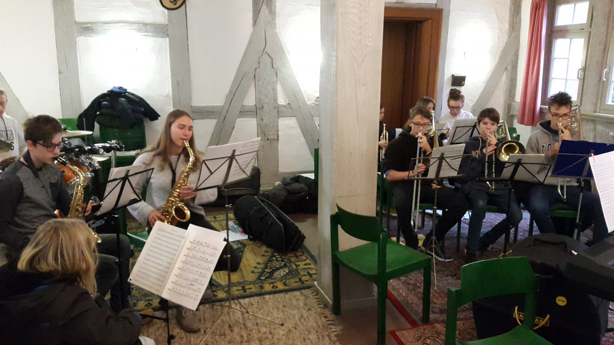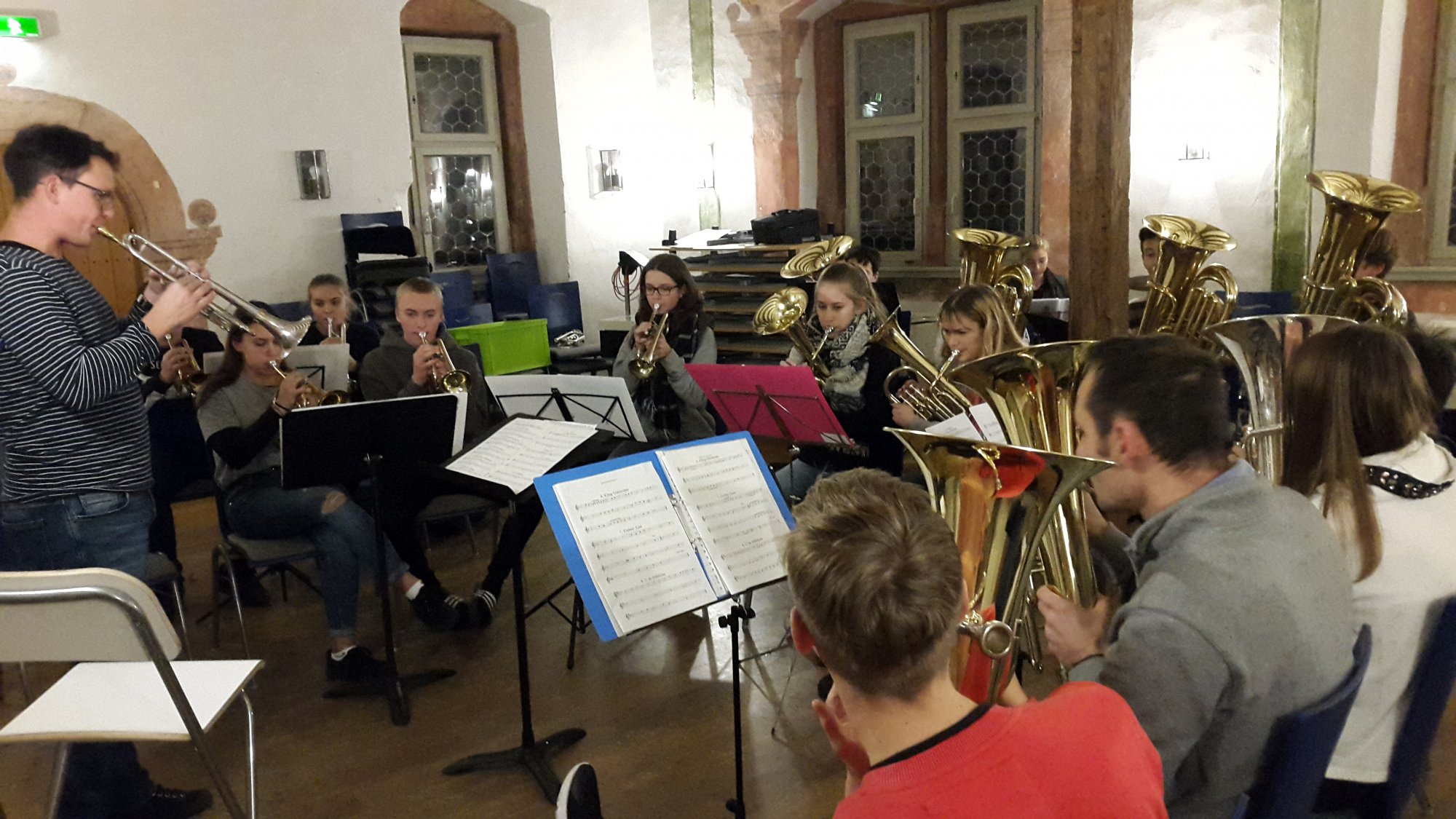 Hoch oben im Turmzimmer der Burg dirigierten Herr Eckert und Herr Griesbeck abwechselnd die Brass Band. Ein Ensemble, zusammengesetzt ausschließlich aus Eigengewächsen der Ziehenschule. Von tiefen Tubentönen bis hin zu hoch geblasenen Trompeten sind alle Blechblasinstrumente wie in einer echten englischen Brassband vertreten.