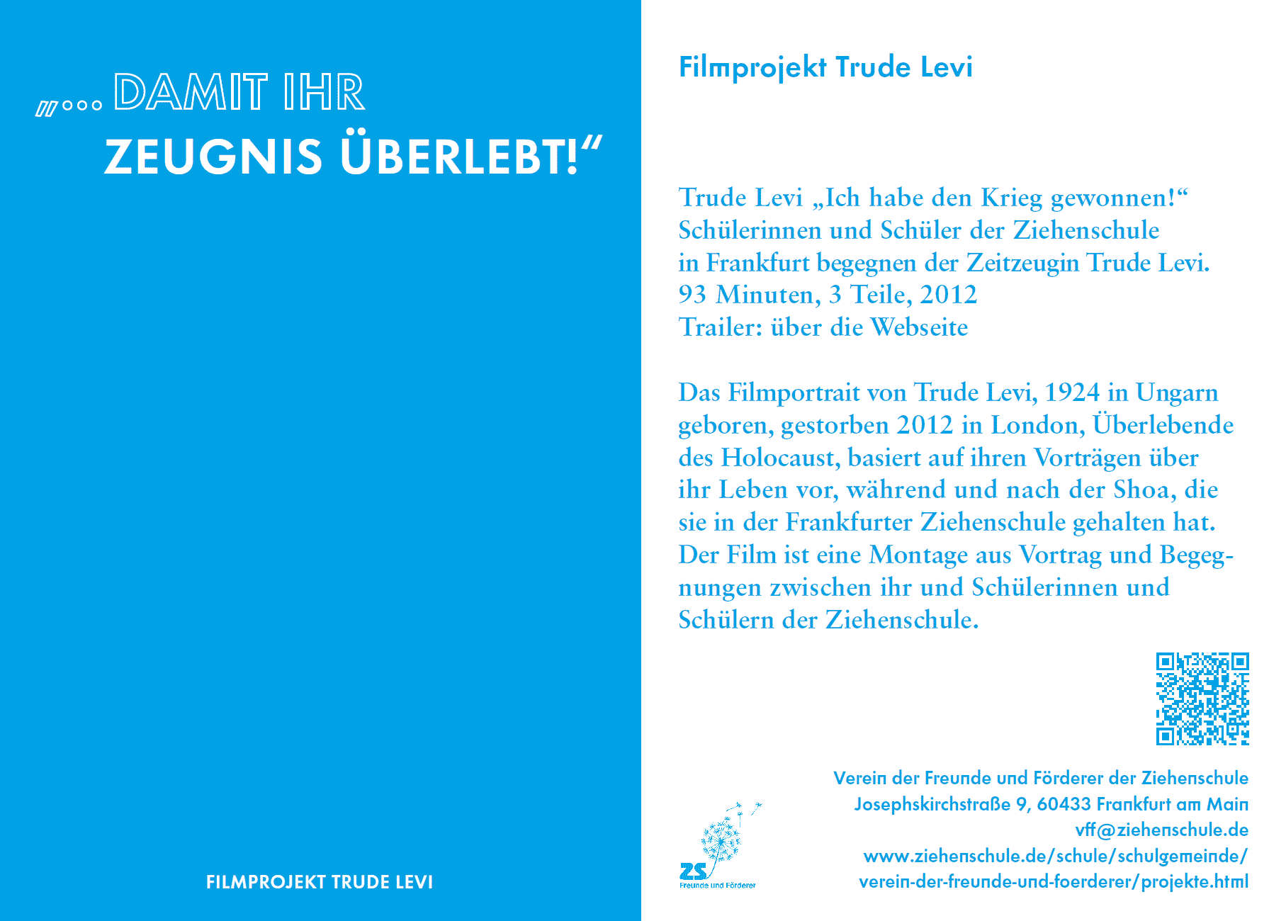 Am 9. Dezember 2021 eröffnet im Historischen Museum die Ausstellung „Frankfurt und der NS“. Sechzehn kooperierende Initiativen, die sich mit der Thematik befassen, sind Bestandteil des Rahmenprogramms der Ausstellung. Eine dieser Initiativen ist ein Projekt ehemaliger Schülerinnen und Schüler und Lehrerinnen der Ziehenschule. Dabei handelt es sich um das Filmprojekt „Trude Levi - Ich habe den Krieg gewonnen.“