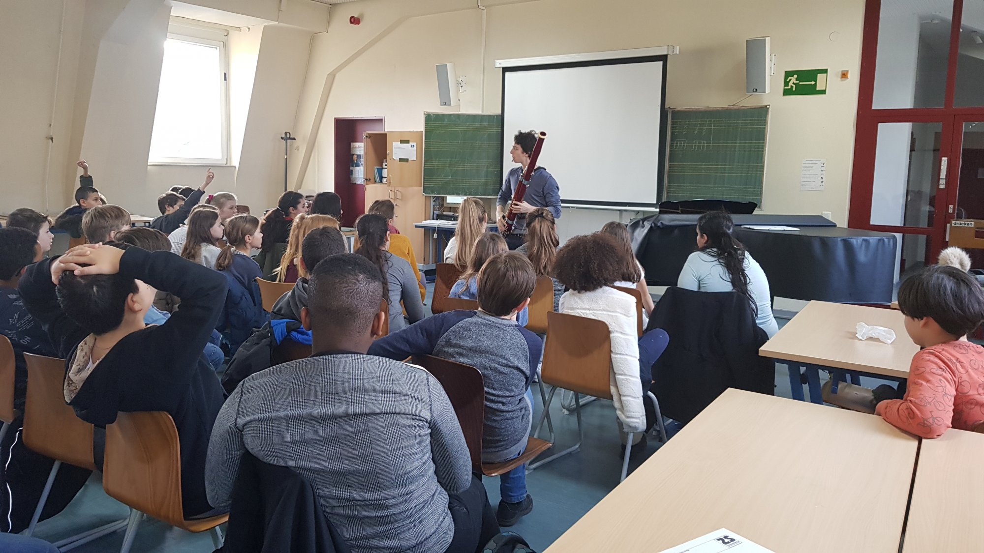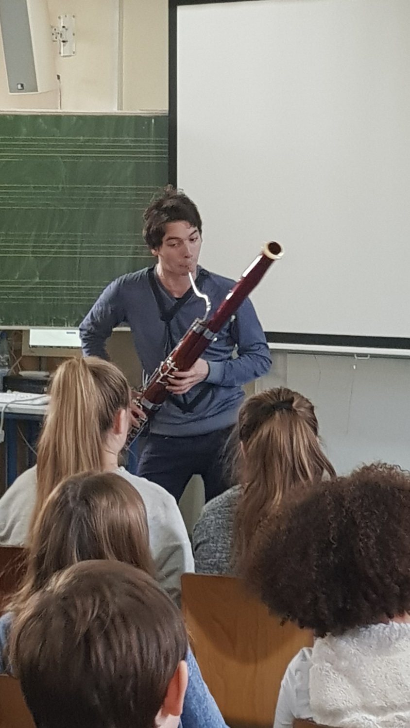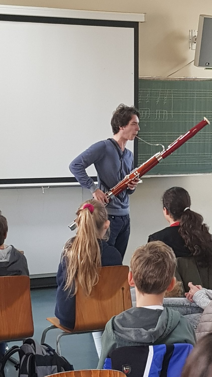 Am 19.12.2019 fand im Musikraum ein Gesprächskonzert mit dem Solo-Fagottisten des Sinfonieorchesters des Hessischen Rundfunks Theo Plath statt. Den Kindern der beiden fünften Klassen wurden unterschiedliche Musikstücke aus verschiedenen Epochen vorgespielt, so dass die Schülerinnen und Schüler den besonderen Klang dieses außergewöhnlichen Instrumentes kennenlernen konnten. Im Anschluss beantwortetet Herr Plath alle Fragen der Kinder.
