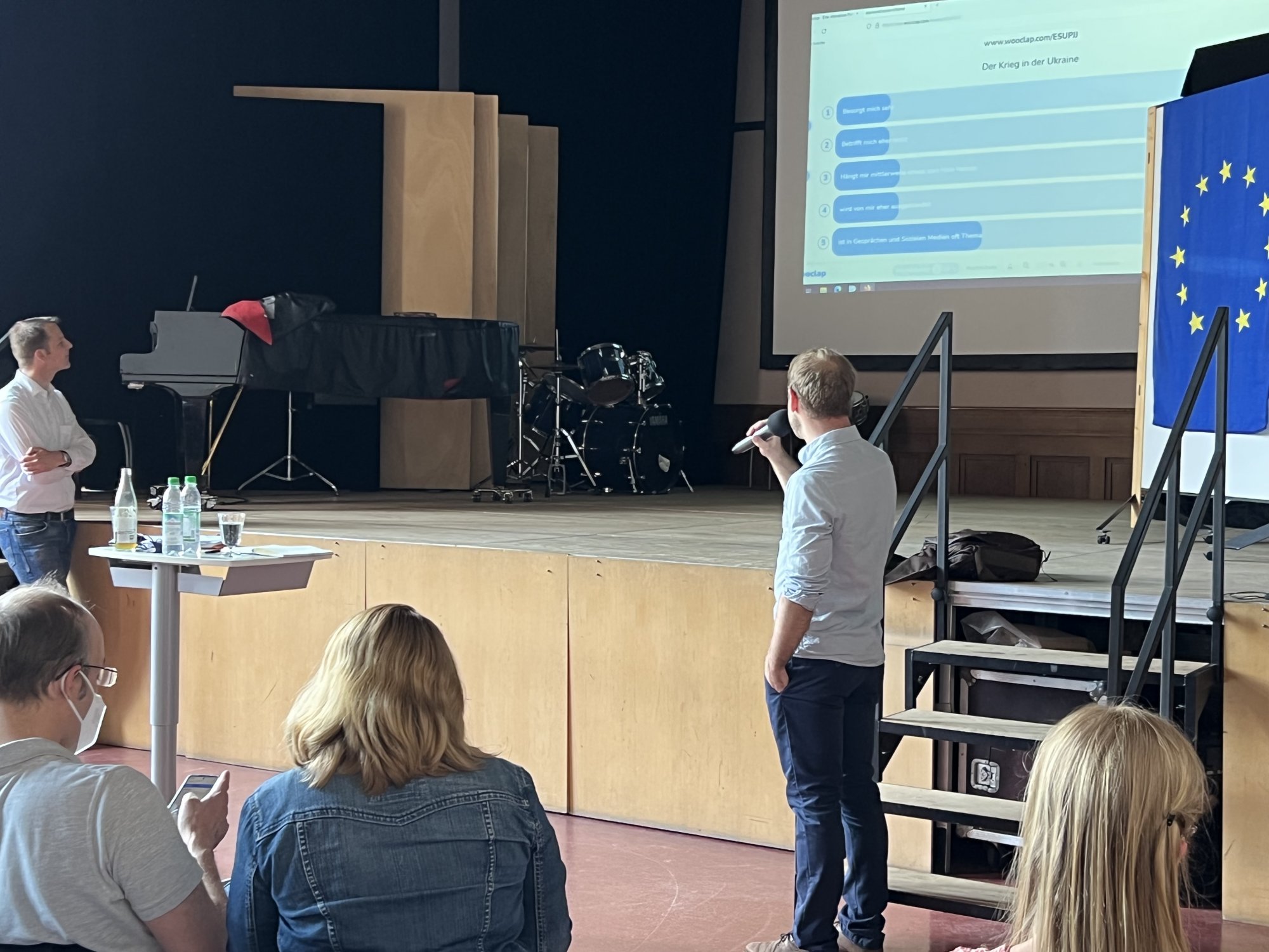 Mit Stefan Kroll war der Leiter der Wissenschaftskommunikation der "Hessischen Stiftung für Friedens- und Konfliktforschung" (HSFK) an der Ziehenschule zu Besuch, um über den Krieg Russlands in der Ukraine zu sprechen. Herr Kroll berichtete insbesondere von der Perspektive der Friedensforschung auf den Konflikt und auch davon, wie Frieden wieder herzustellen sein könnte. Heiß diskutiert wurde unter anderem die Frage, ob weitere finanzielle Ressourcen für die Bundeswehr mutig oder doch übermütig sind.