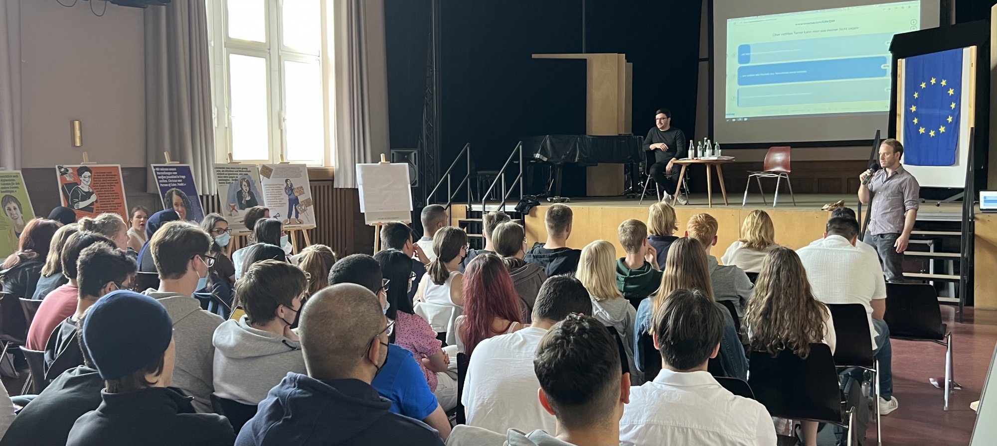 Unter den Rahmenthema „Europa – Mut für die Zukunft“ hat vom 9. bis zum 13. Mai 2022 die Europawoche an der Ziehenschule stattgefunden: Dabei konnten sich die Schülerinnen und Schüler dem Rahmenthema in insgesamt sechs Groß-Veranstaltungen und diversen kleinen Unterrichtsprojekten von unterschiedlichen Perspektiven aus nähern. Denn: Rassismus, Klimawandel und der russische Angriffskrieg auf die Ukraine sind nur drei Beispiele dafür, dass Mut heute eine wichtiger Wert sein könnte – doch was würde es bedeuten angesichts dieser Herausforderungen Mut zu beweisen? Können wir Menschen identifizieren, die das bereits in den unterschiedlichen Kontexten tun? Und: gegen welche weiteren Strukturen scheint es geboten, Mut zu beweisen? Diesen und weiteren Fragen gingen die Veranstaltungen nach.