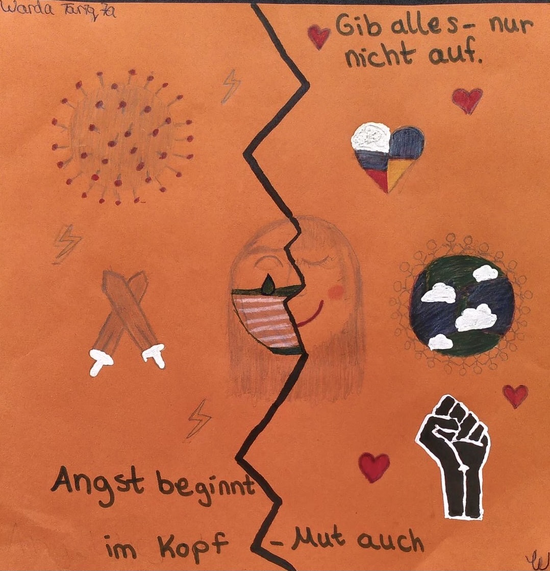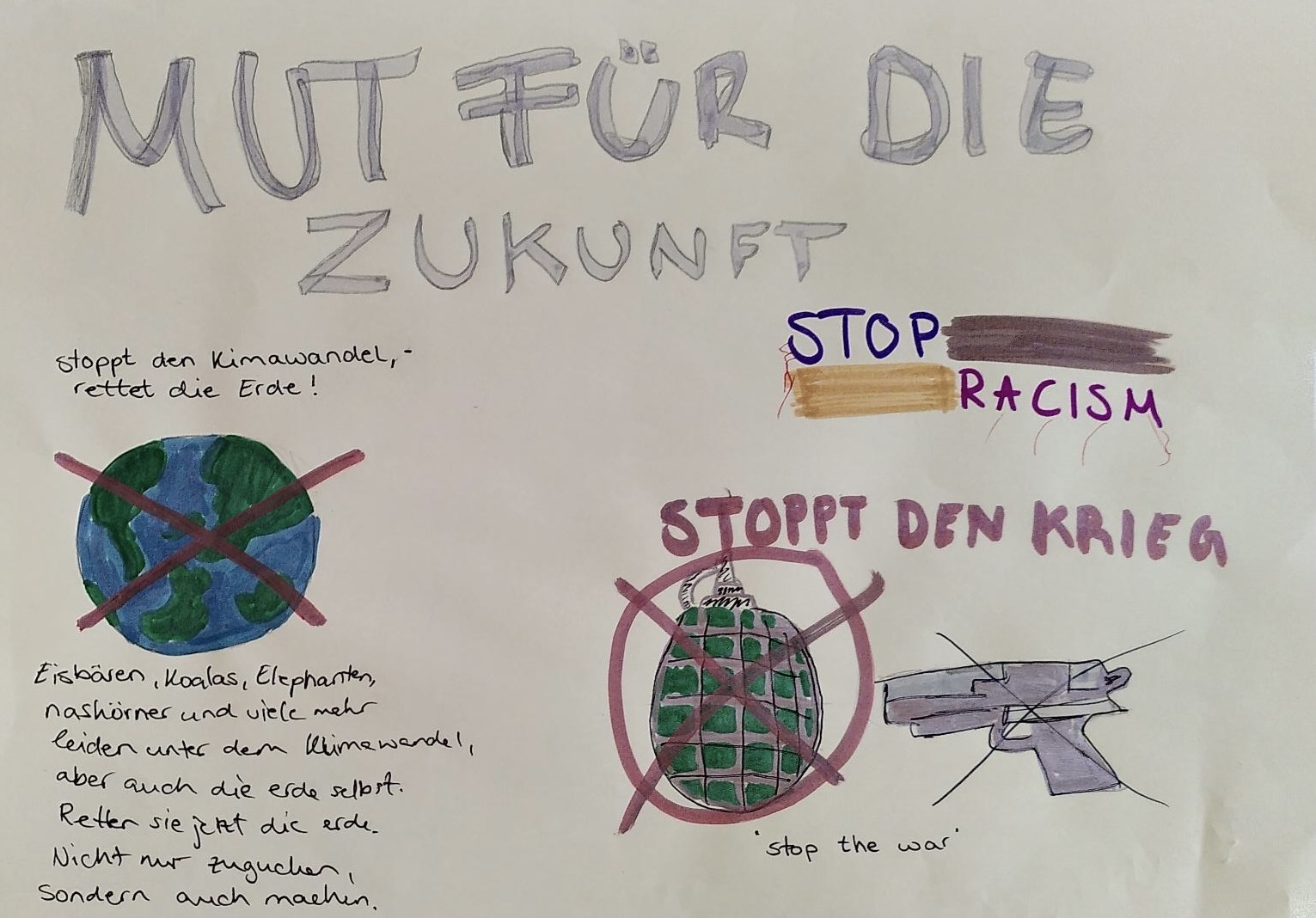 Die Klasse 7a stellte sich auch die Frage, was denn „Mut für die Zukunft“ heute eigentlich bedeutet und erstellte sehr vielfältige Plakate zu den Themen Anti-Rassismus, Krieg in der Ukraine und Klimawandel.