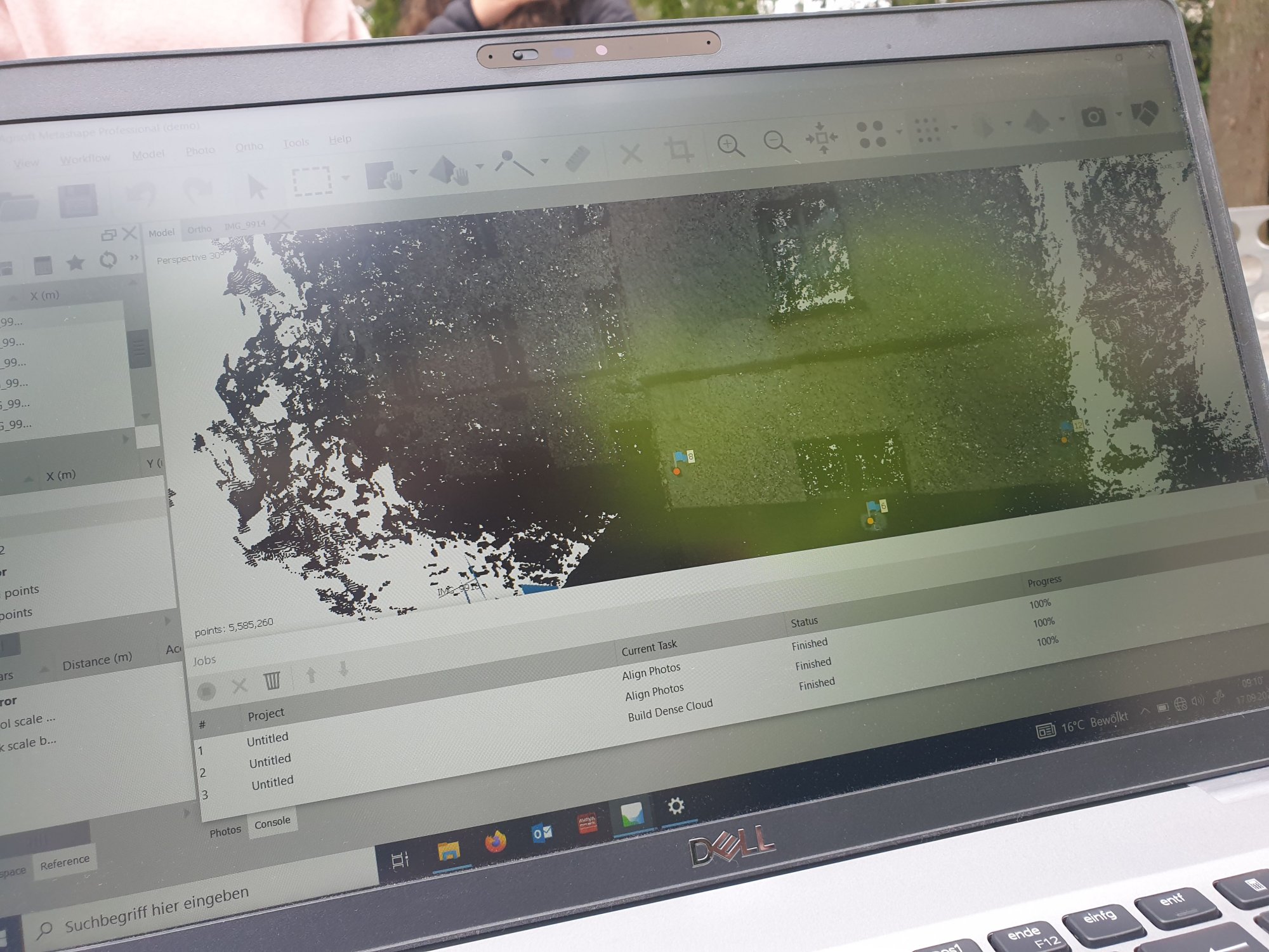 An der 5ten Station ging es um Laserscanning. Ein Laserscanner scannt hier seine Umgebung, welche anschließend mithilfe einer „Faro Scene“-Software ausgewertet werden kann. Diese Bilder erscheinen dann auf dem Laptop. Durch ein Laserscanning können zum Beispiel die Breite, Höhe etc. eines Gebäudes bestimmt werden. Es ist eine flächenhafte Messung, bei der bis zu einer Millionen Punkte gemessen und verarbeitet werden. Im Gegensatz zur Photogrammetrie gibt es hier eine höhere Punktgenauigkeit.