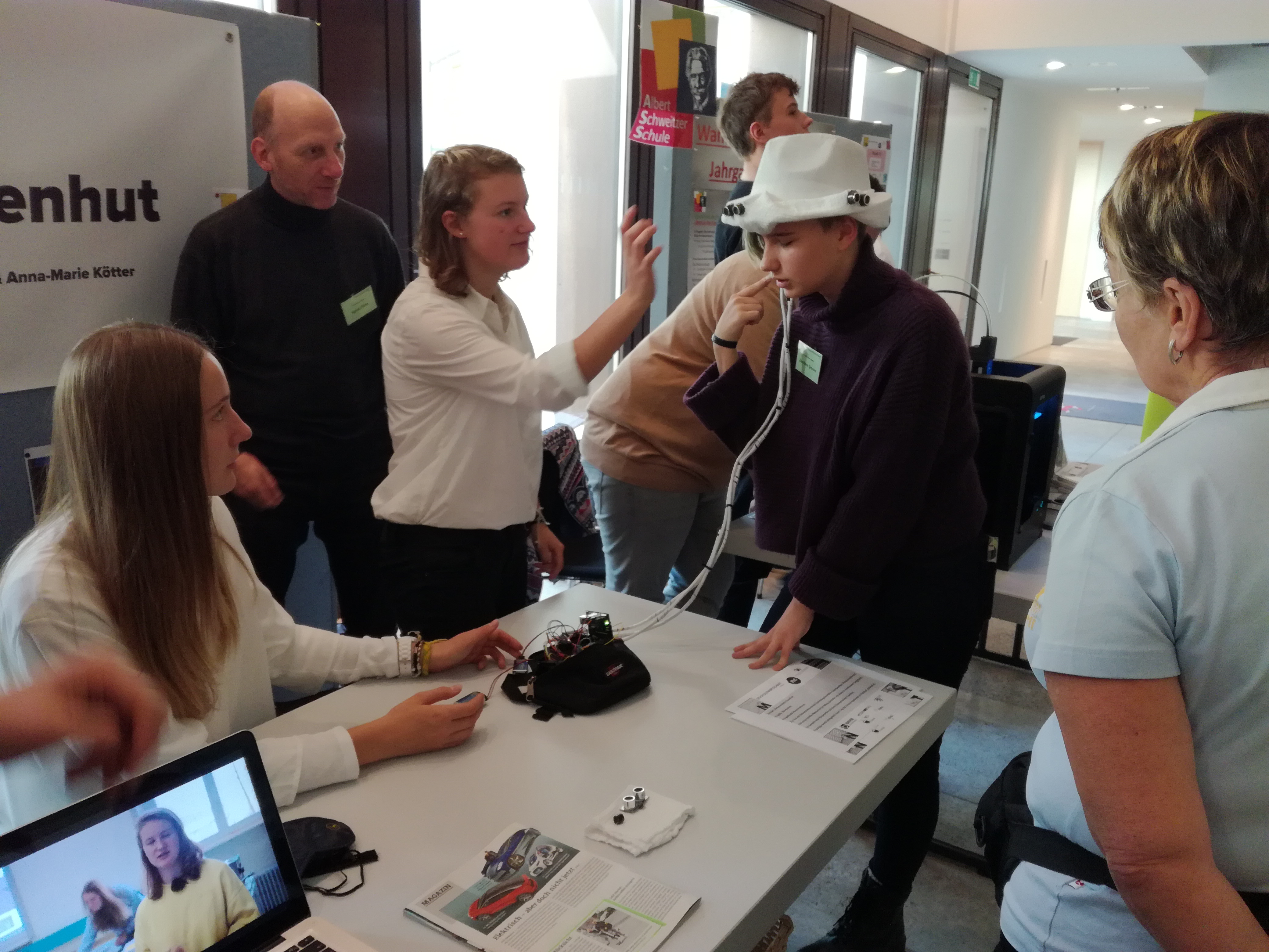 Franziska Benzin und Anna-Marie Kötter (beide E-Phase) stellten am 13. November auf der MINT-Messe im hessischen Landtag ihren Blindenhut - auch Fledermauskappe genannt - vor. Der Hut wurde in der Junior-Ingenieur-Akademie entwickelt. Er besteht aus Ultraschallsensoren und Ausgabemedien; das Ziel ist es, blinden Menschen in unbekannter Umgebung helfen zu können. Dieses durchdachte, hilfreiche und innovative Produkt sowie die tolle Präsentation der beiden Schülerinnen überzeugten die Jury und die Ziehenschule kann sich über den mit 500 Euro dotierten Sonderpreis des VDMA (Verband deutscher Maschinen- und Anlagenbauer) freuen.