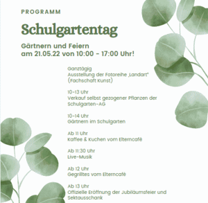 Das Team des Schulgartentages hat ein abwechslungsreiches Programm zusammengestellt. Neben den Arbeiten im Schulgarten, dem Verkauf selbst gezogener Pflanzen und Botanischen Führungen gibt es Mikroskopie-Workshops und eine Ausstellung der Fotoreihe "Landart". Es gibt Kaffee und Kuchen, Gegrilltes vom Elterncafé, Sektausschank, Live-Musik, Sportspiele und eine Lesung von Jochen Till (Alumni) aus „Luzifer junior“ ...