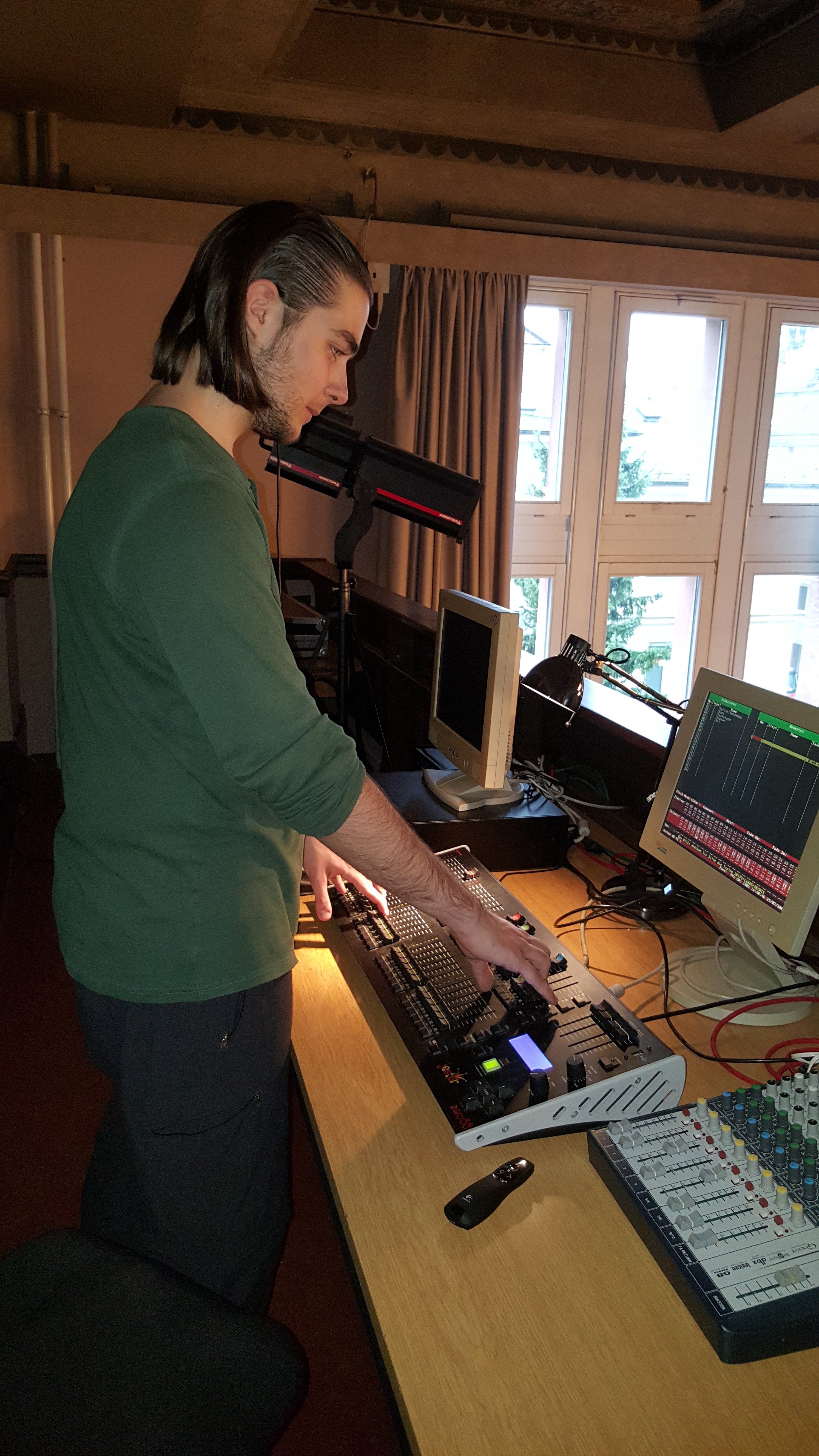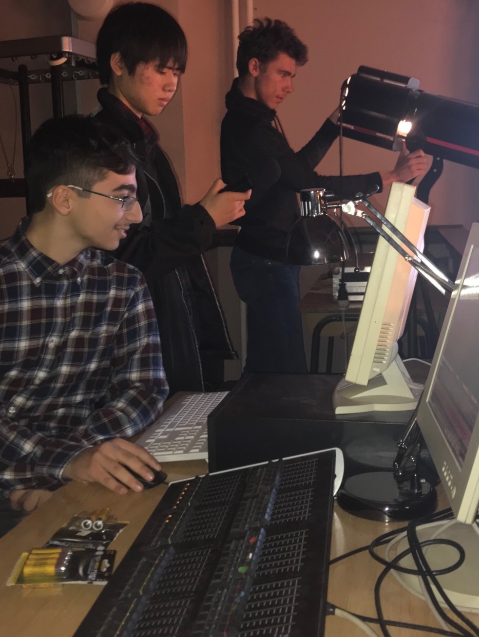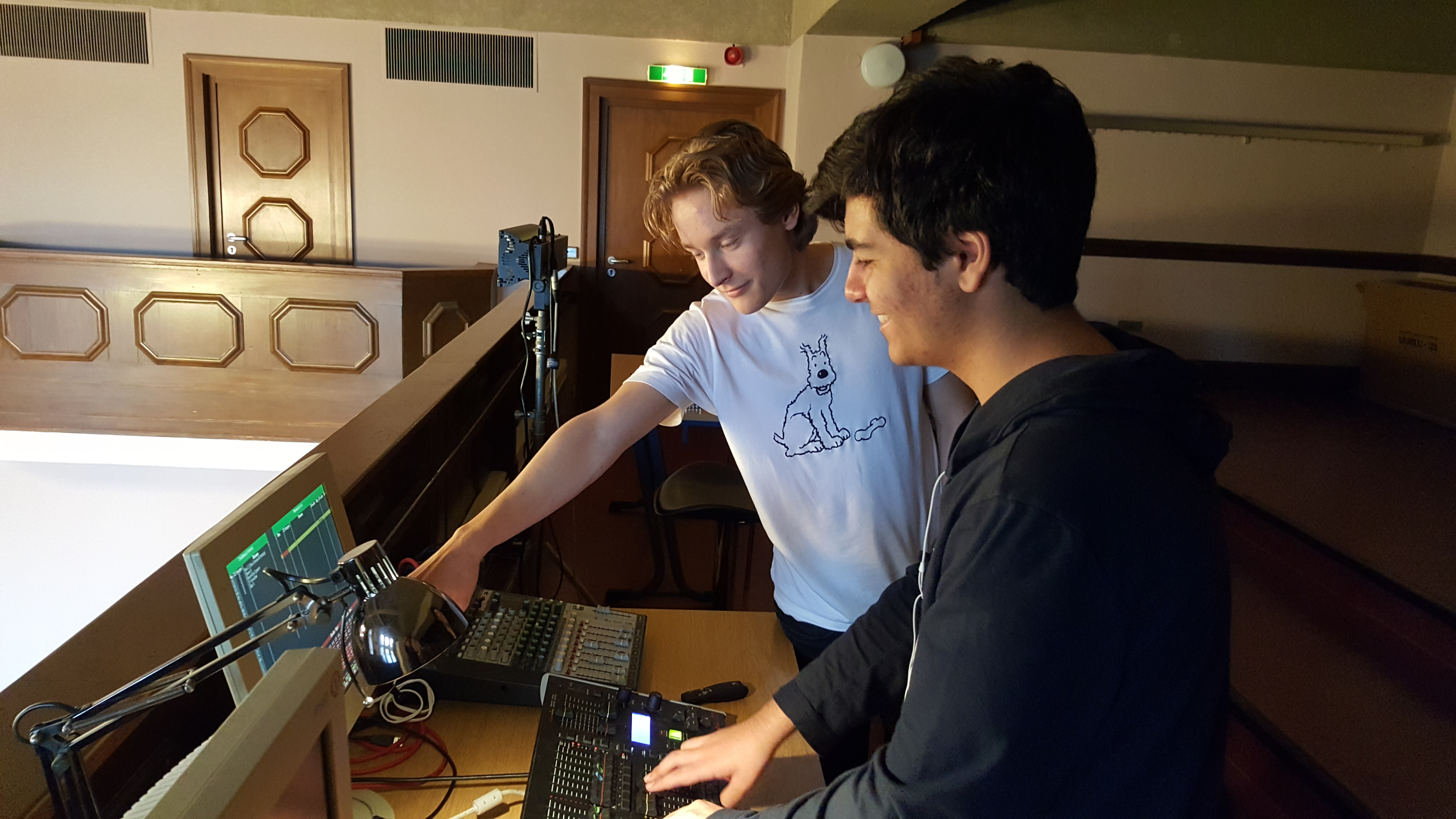 „Tja, also wie kommt man zur Aulatechnik? Bei mir war das eher spontan, Phil hat mich zu einem Treffen mitgeschleppt und Frau Stegmüller hat mich dann noch gebeten, meine E-Mail-Adresse und meine Klasse auf einen Zettel zu schreiben, und seitdem bin ich dabei. Seitdem kümmere ich mich mit den anderen darum, dass bei Veranstaltungen in der Aula das Licht auf der Bühne stimmt, dass der Beamer läuft und dass man die Leute vernünftig hört. Das hat bis jetzt sehr viel Spaß gemacht und gelernt hab ich auch einiges. Ansonsten kommt man wie Arian in die Aulatechnik und fragt die AG-Leitung (inzwischen ist das Herr Nguyen), wobei Arian eigentlich nur irgendwelche NBA Videos auf dem Beamer mit fetten Boxen schauen will. :D“