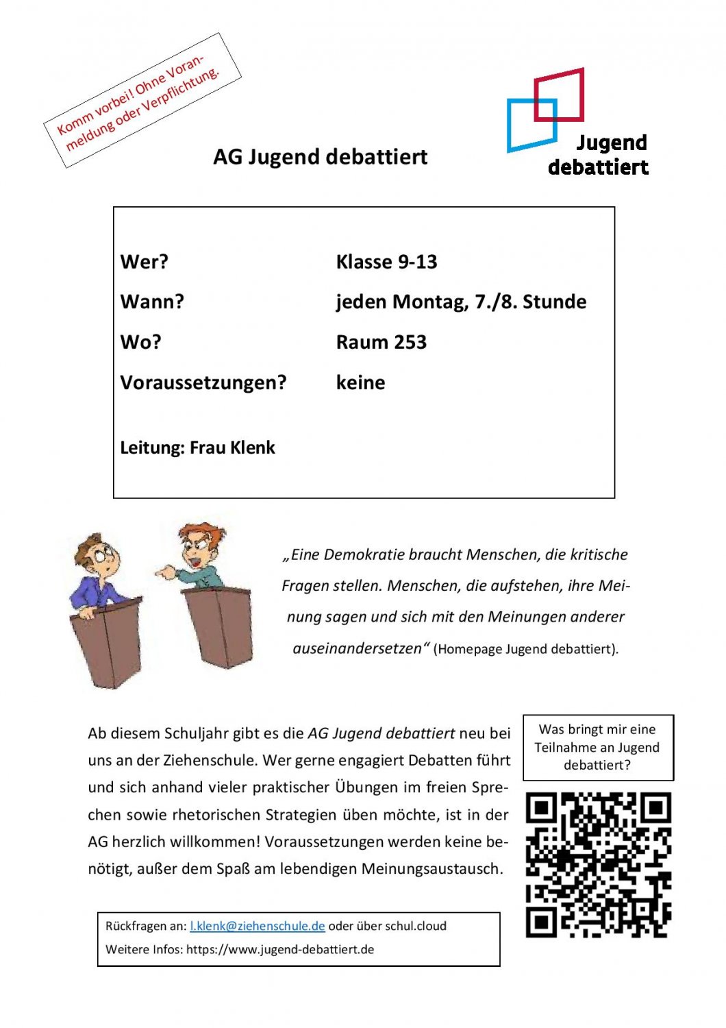 Das Angebot richtet sich an alle Schülerinnen und Schüler der Klassen 9-13 und findet Montags in der 7./8. Stunde in Raum 253 statt. Rückfragen gern per schul.cloud an oder Email an l.klenk@ziehenschule.de. Weitere Infos: https://www.jugend-debattiert.de. Der QR-Code führt zu diesem weiterführenden Youtube-Video.