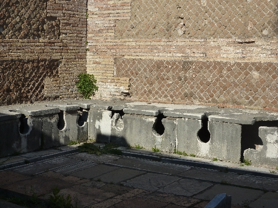 - Latrinen in Ostia Antica und Speisekarte an der Wand einer Taverne in Ostia Antica