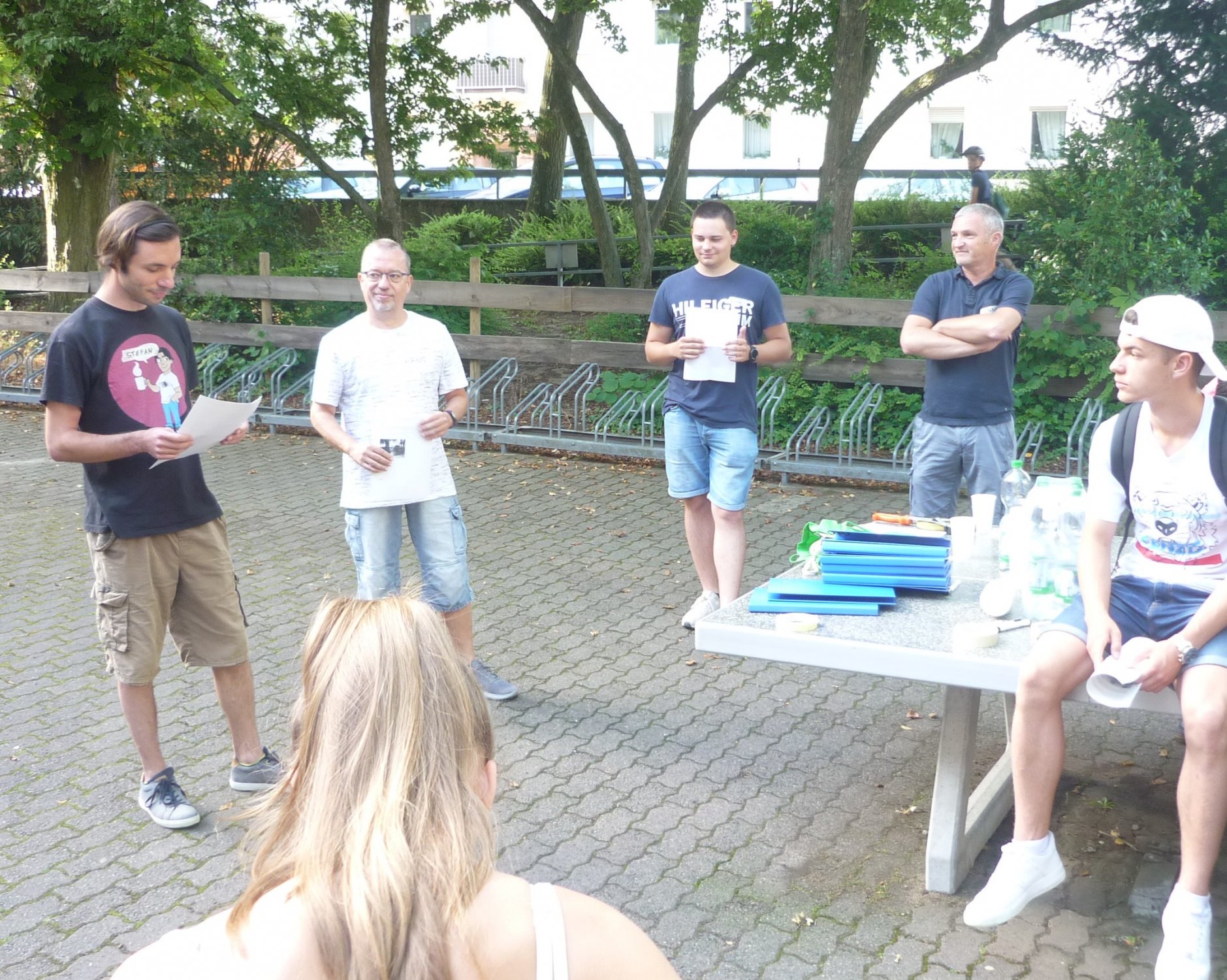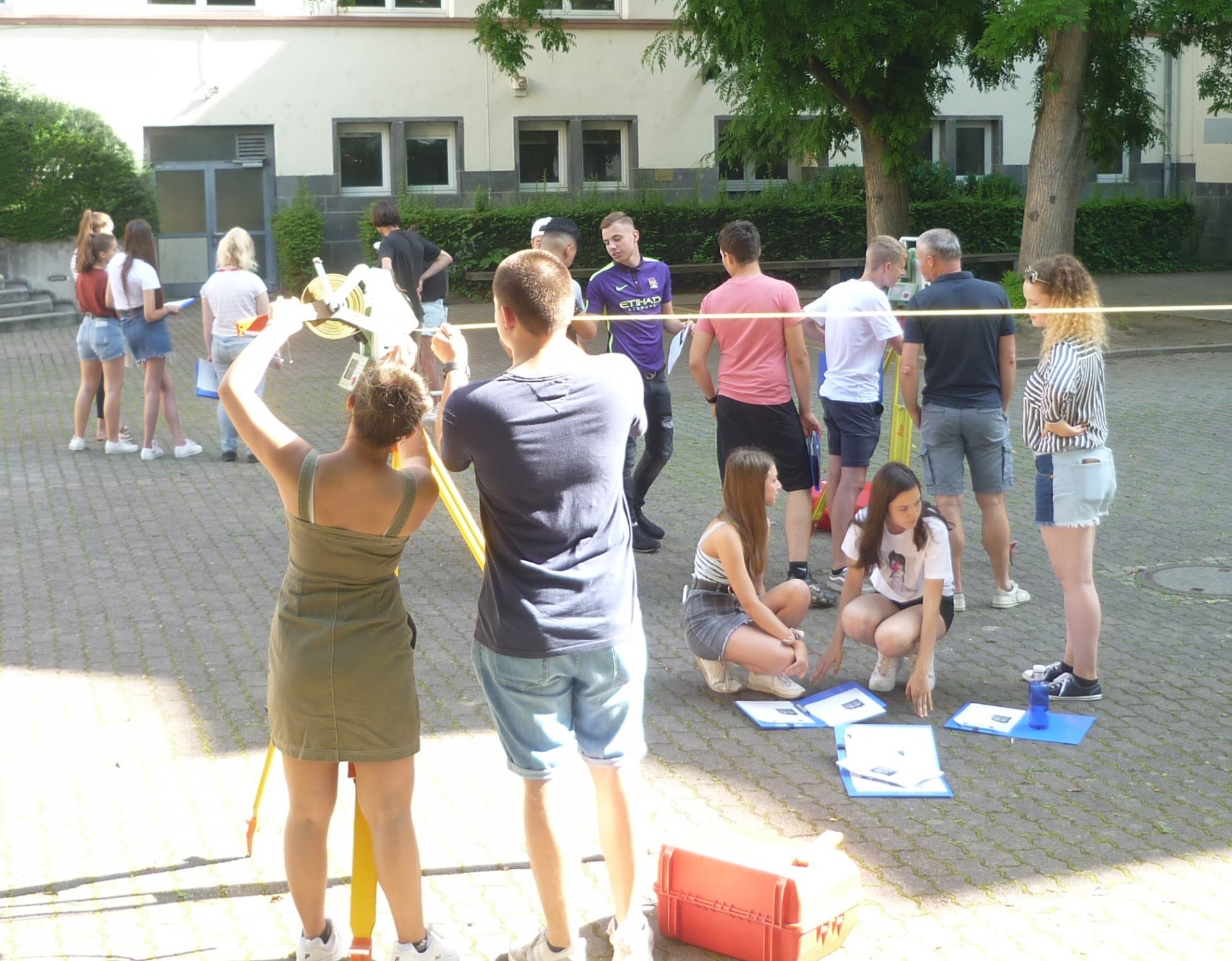 Unter fachkundiger Anleitung durch Stefan Ruß und sein Team vom Stadtvermessungsamt Frankfurt haben die Lernenden der Klasse 9e in der Themenwoche vor den Sommerferien Gebäudeteile und Geländestücke vermessen. Gelegentlich wird im Matheunterricht die Frage gestellt „Wofür brauche ich das?“. Bezogen auf die Trigonometrie konnten die Schülerinnen und Schüler bei ihren Vermessungen hautnah erfahren, wo und wie die Mathematik genutzt wird. Mithilfe von Längen- und Winkelmessungen können die Entfernung zu einem unzugänglichen Punkt im Gelände, Höhenunterschiede im Gelände oder Steigungen bestimmt werden.