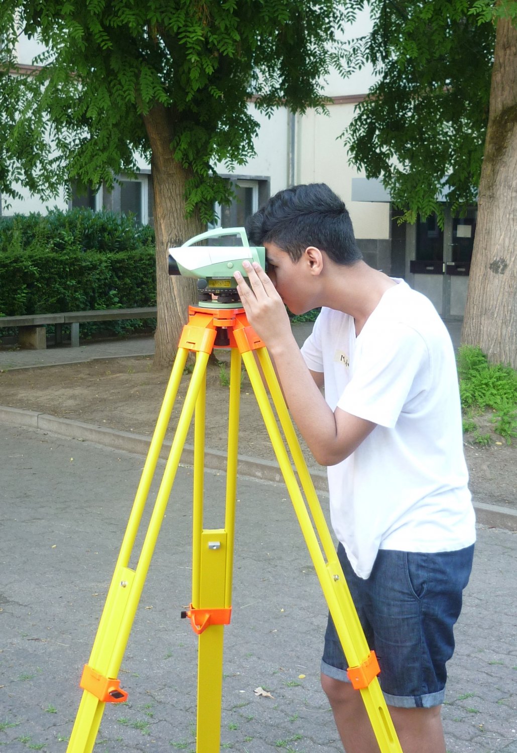 Mit Tachymeter, Theodolit und Nivelliergerät auf dem Schulgelände unterwegs